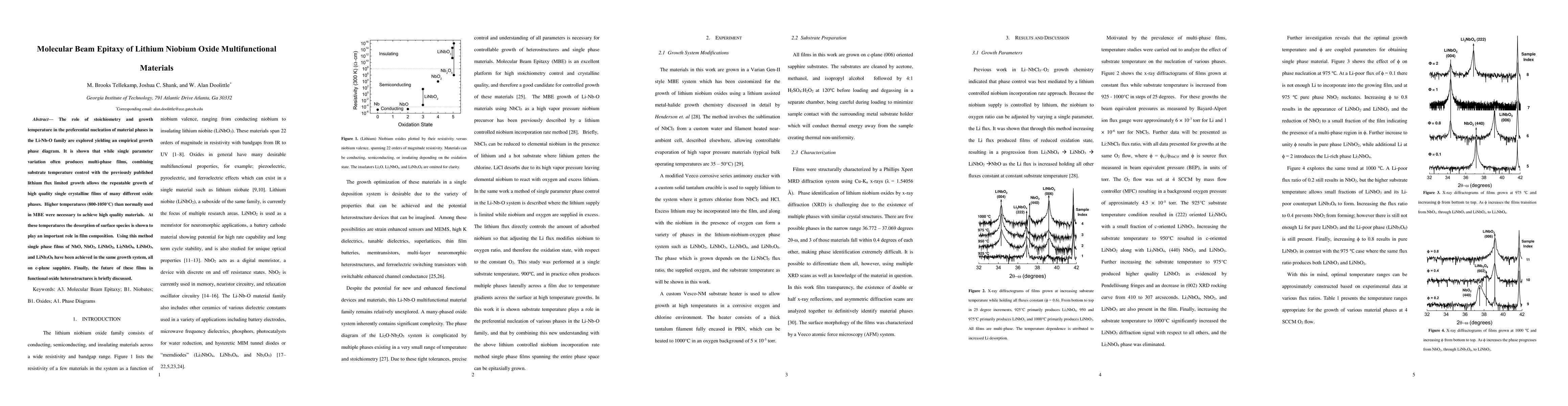 The research presents an empirical growth phase diagram for Li-Nb-O materials, demonstrating that controlling substrate temperature and utilizing lithium flux limited growth enables the reproducible formation of high-quality single crystalline films of various oxide phases. High growth temperatures (800-1050 °C) were crucial for achieving these results, with surface species desorption impacting film composition. The method successfully produced single-phase films of NbO, NbO2, LiNbO2, Li3NbO4, LiNbO3, and LiNb3O8 on c-plane sapphire, paving the way for their use in functional oxide heterostructures.