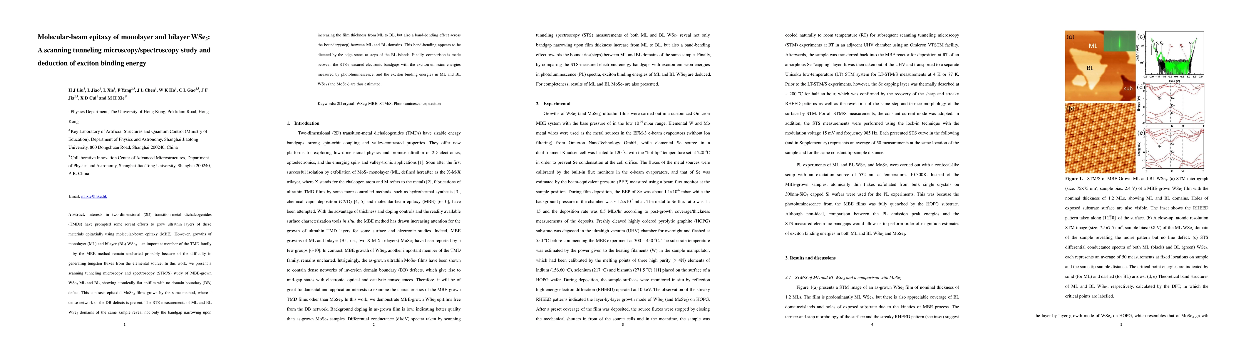 This study explores the molecular-beam epitaxy growth of WSe2 monolayer and bilayer using scanning tunneling microscopy/spectroscopy, revealing atomically flat films without domain boundary defects. Excitons' binding energies in these films are deduced by comparing electronic bandgaps from spectroscopy with photoluminescence exciton emission energies.