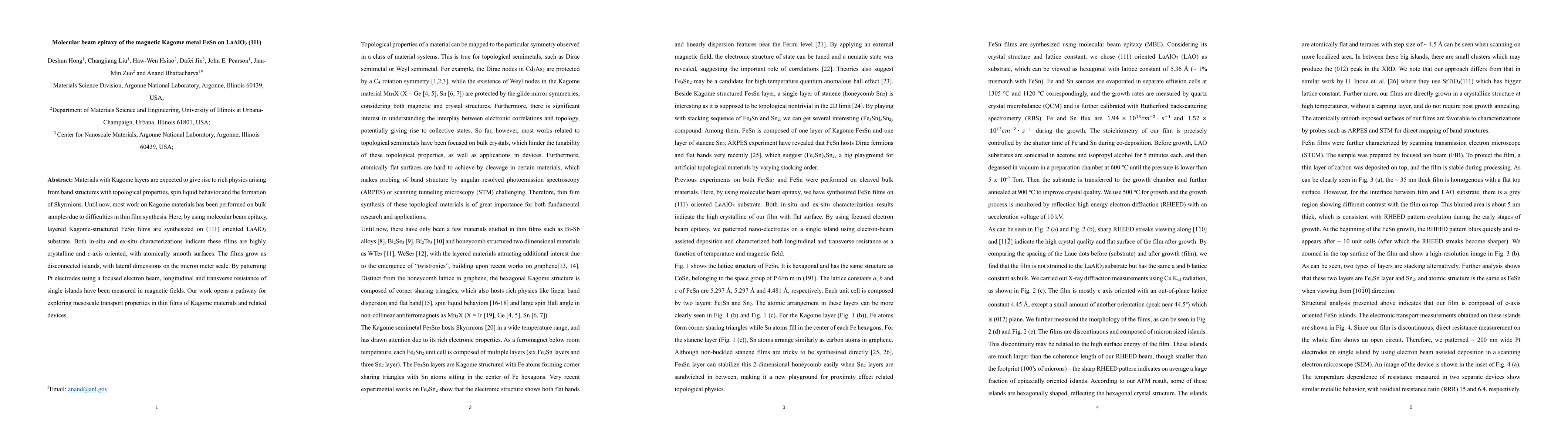 Materials with a layered Kagome lattice are expected to give rise to novel physics arising from band structures with topological properties, spin liquid behavior and the formation of skyrmions. Until now, most work on Kagome materials has been performed on bulk samples due to difficulties in thin film synthesis. Here, by using molecular beam epitaxy, layered Kagome-structured FeSn films are synthesized on (111) oriented LaAlO3 substrate. Both in-situ and ex-situ characterizations indicate these films are highly crystalline and c-axis oriented, with atomically smooth surfaces. However, the films grow as disconnected islands, with lateral dimensions on the micron scale. By patterning Pt electrodes using a focused electron beam, longitudinal and transverse resistance of single islands have been measured in magnetic fields. Our work opens a pathway for exploring mesoscale transport properties in thin films of Kagome materials and related devices.