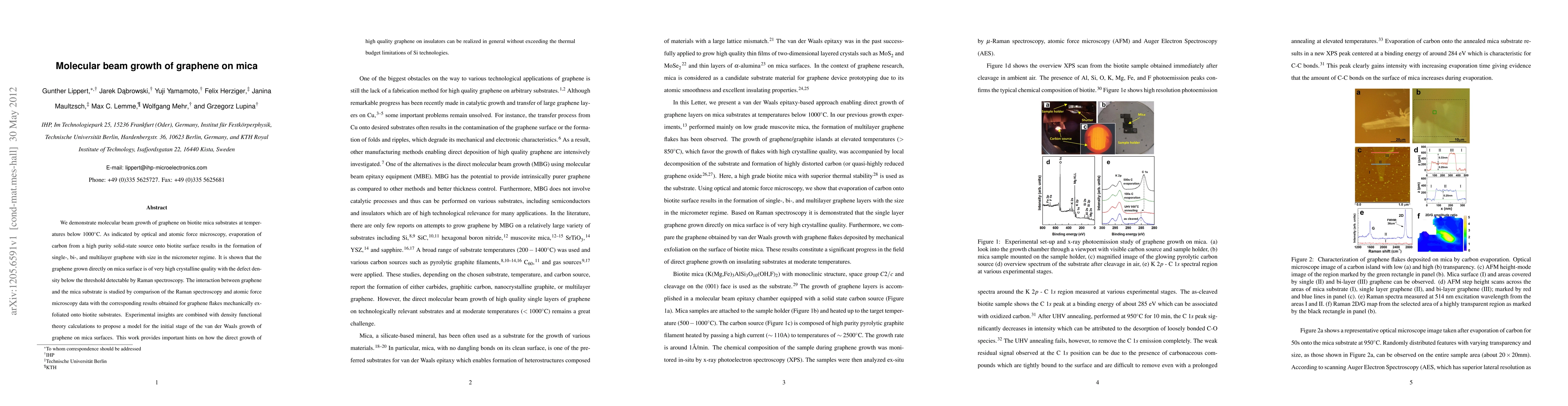 This paper details the molecular beam growth of high-quality graphene on biotite mica substrates at low temperatures, resulting in single, bi-, and multilayer graphene with minimal defects. The study combines experimental and theoretical approaches to propose a model for the van der Waals growth mechanism, offering insights for graphene synthesis on insulators without damaging thermal constraints.