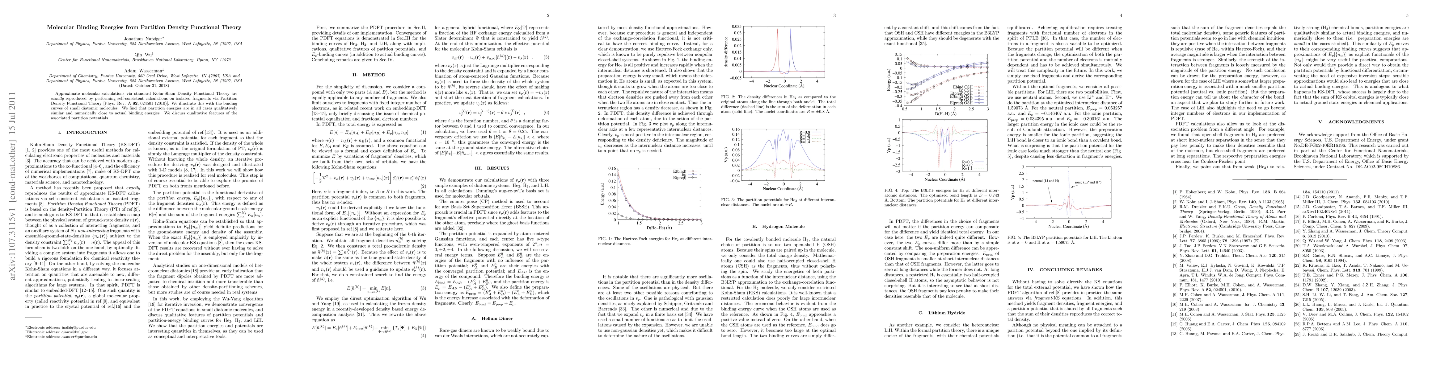 This paper demonstrates that Partition Density Functional Theory accurately reproduces Kohn-Sham Density Functional Theory calculations for molecular binding energies by performing self-consistent calculations on isolated fragments. The study shows that partition energies closely match actual binding energies for small diatomic molecules, highlighting the qualitative similarities in partition potentials.