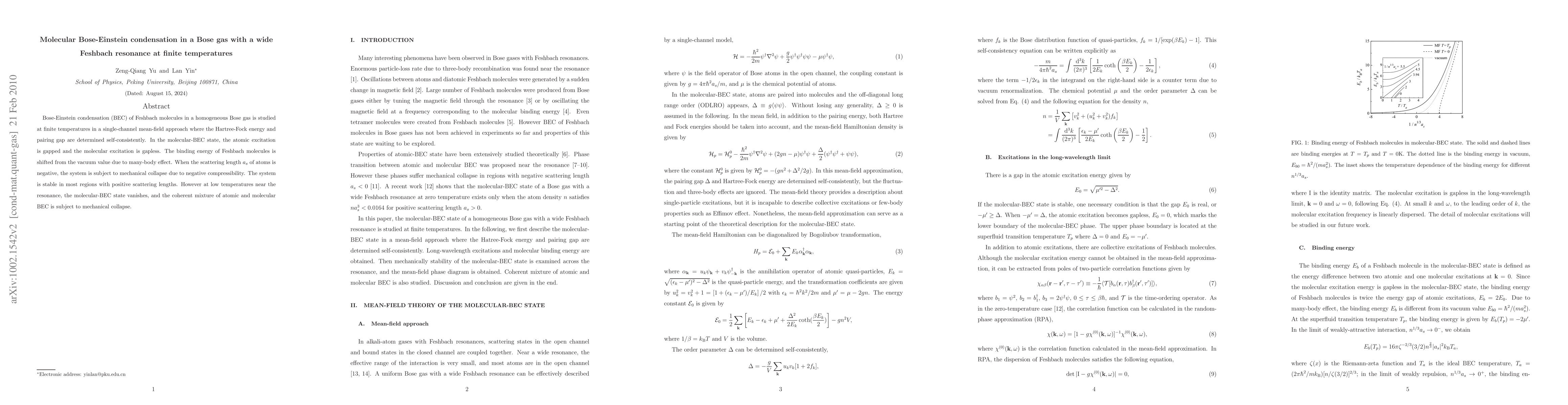 The paper presents a detailed analysis of molecular BEC in a Bose gas with a wide Feshbach resonance at finite temperatures, including a self-consistent determination of the Hartree-Fock energy and pairing gap.