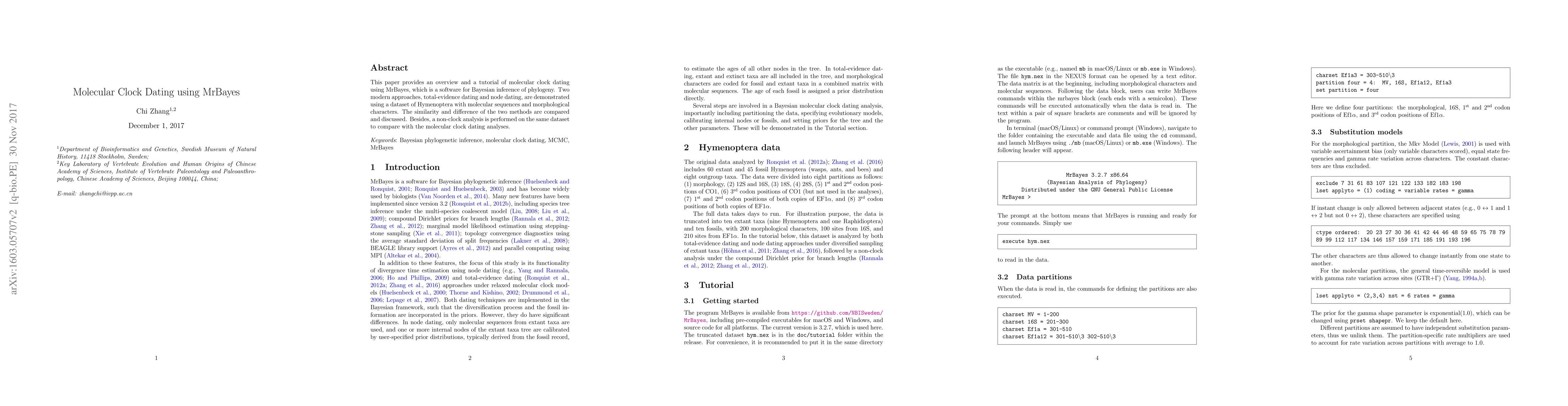 This paper demonstrates two modern approaches to molecular clock dating using MrBayes on a dataset of Hymenoptera species, comparing their similarities and differences.