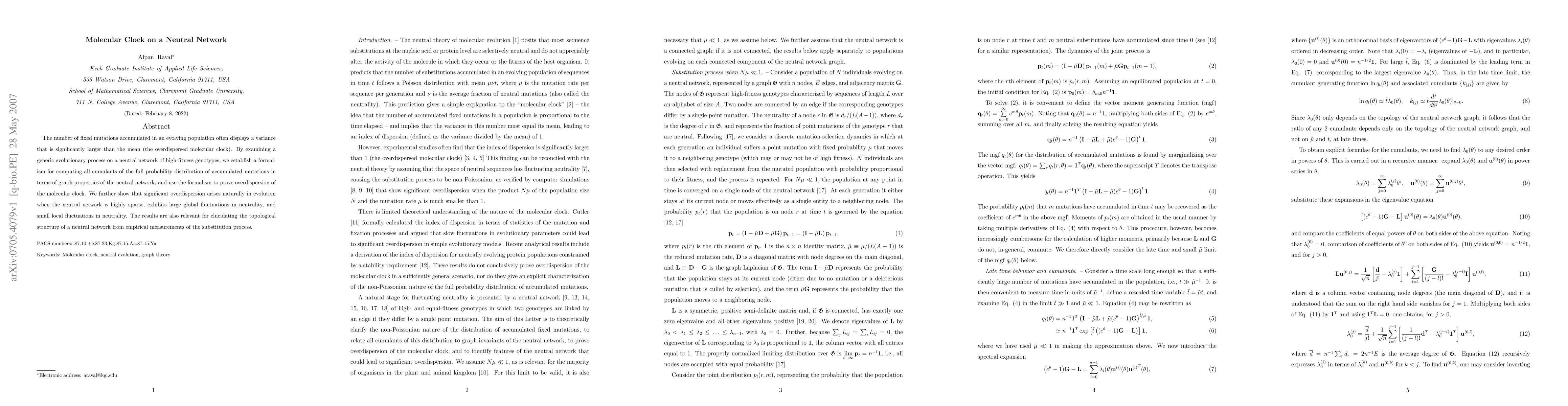 The number of fixed mutations accumulated in an evolving population often displays a variance that is significantly larger than the mean (the overdispersed molecular clock). By examining a generic evolutionary process on a neutral network of high-fitness genotypes, we establish a formalism for computing all cumulants of the full probability distribution of accumulated mutations in terms of graph properties of the neutral network, and use the formalism to prove overdispersion of the molecular clock. We further show that significant overdispersion arises naturally in evolution when the neutral network is highly sparse, exhibits large global fluctuations in neutrality, and small local fluctuations in neutrality. The results are also relevant for elucidating the topological structure of a neutral network from empirical measurements of the substitution process.