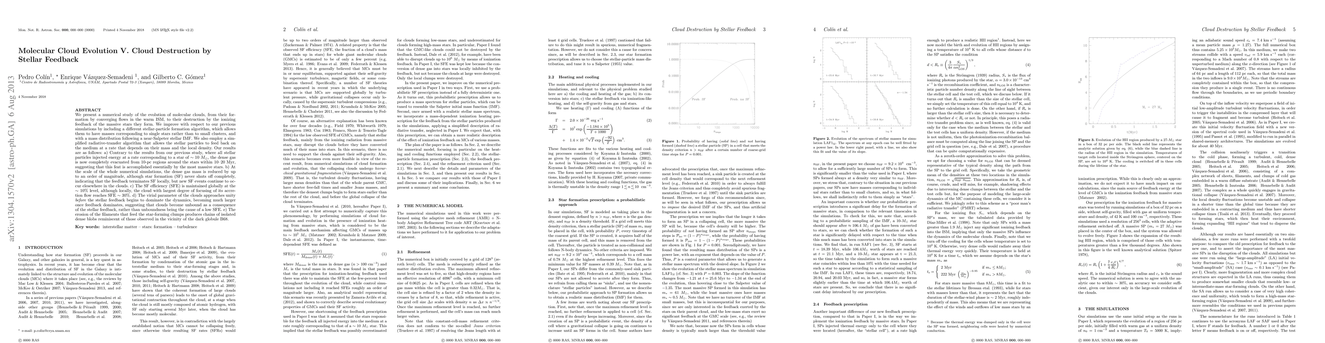 We present a numerical study of the evolution of molecular clouds, from their formation by converging flows in the warm ISM, to their destruction by the ionizing feedback of the massive stars they form. We improve with respect to our previous simulations by including a different stellar-particle formation algorithm, which allows them to have masses corresponding to single stars rather than to small clusters, and with a mass distribution following a near-Salpeter stellar IMF. We also employ a simplified radiative-transfer algorithm that allows the stellar particles to feed back on the medium at a rate that depends on their mass and the local density. Our results are as follows: a) Contrary to the results from our previous study, where all stellar particles injected energy at a rate corresponding to a star of ~ 10 Msun, the dense gas is now completely evacuated from 10-pc regions around the stars within 10-20 Myr, suggesting that this feat is accomplished essentially by the most massive stars. b) At the scale of the whole numerical simulations, the dense gas mass is reduced by up to an order of magnitude, although star formation (SF) never shuts off completely, indicating that the feedback terminates SF locally, but new SF events continue to occur elesewhere in the clouds. c) The SF efficiency (SFE) is maintained globally at the ~ 10% level, although locally, the cloud with largest degree of focusing of its accretion flow reaches SFE ~ 30%. d) The virial parameter of the clouds approaches unity before the stellar feedback begins to dominate the dynamics, becoming much larger once feedback dominates, suggesting that clouds become unbound as a consequence of the stellar feedback. e) The erosion of the filaments that feed the star-forming clumps produces chains of isolated dense blobs reminiscent of those observed in the vicinity of the dark globule B68.