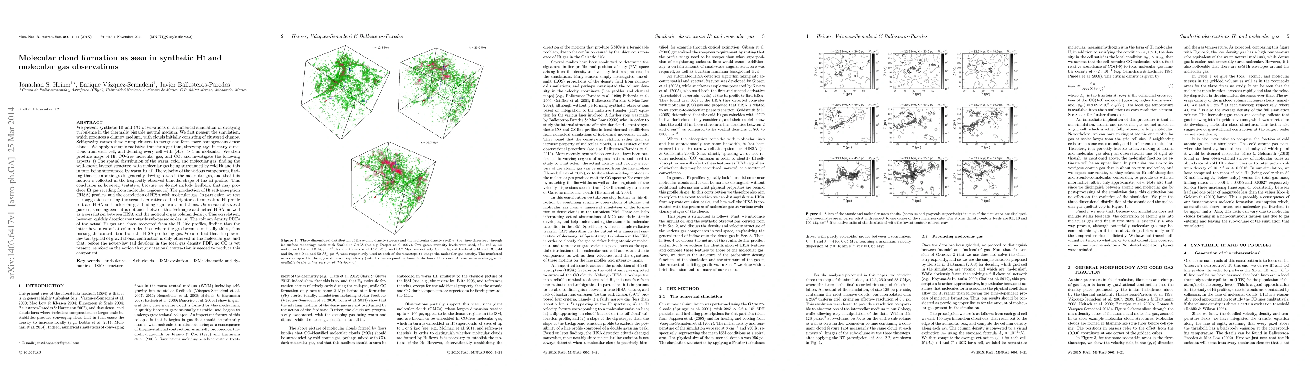 This paper simulates decaying turbulence in a thermally bistable neutral medium to study molecular cloud formation, producing synthetic Hi and CO observations. It finds a layered structure of warm, cold, and molecular gas, with atomic gas flowing towards molecular regions, and explores the correlation between Hi self-absorption profiles and molecular gas, noting limitations in using brightness temperature derivatives for this purpose.
