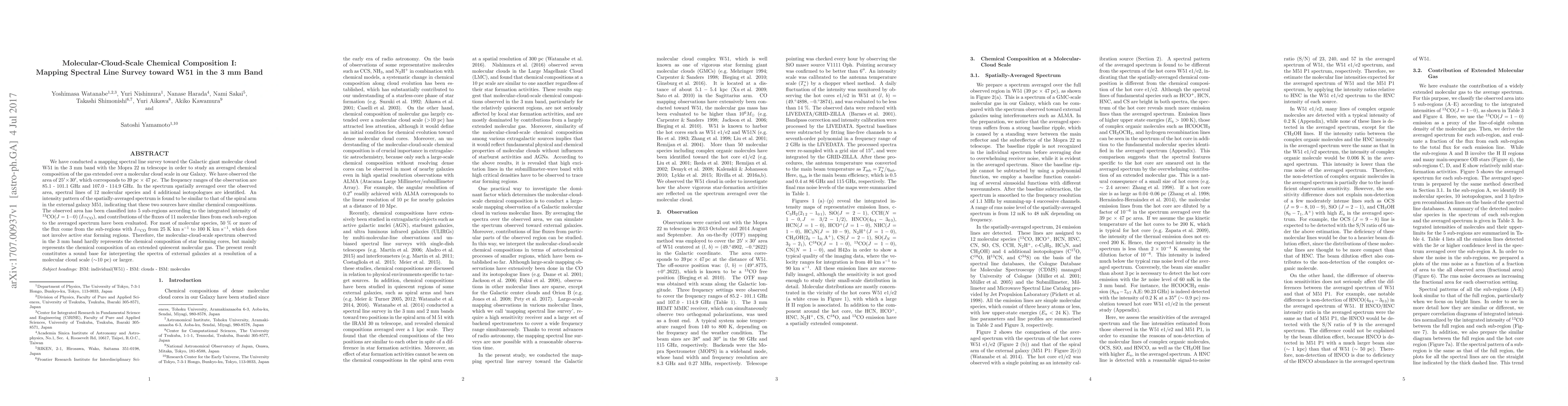 We have conducted a mapping spectral line survey toward the Galactic giant molecular cloud W51 in the 3 mm band with the Mopra 22 m telescope in order to study an averaged chemical composition of the gas extended over a molecular cloud scale in our Galaxy. We have observed the area of $25' \times 30'$, which corresponds to 39 pc $\times$ 47 pc. The frequency ranges of the observation are 85.1 - 101.1 GHz and 107.0 - 114.9 GHz. In the spectrum spatially averaged over the observed area, spectral lines of 12 molecular species and 4 additional isotopologues are identified. An intensity pattern of the spatially-averaged spectrum is found to be similar to that of the spiral arm in the external galaxy M51, indicating that these two sources have similar chemical compositions. The observed area has been classified into 5 sub-regions according to the integrated intensity of $^{13}$CO($J=1-0$) ($I_{\rm ^{13}CO}$), and contributions of the fluxes of 11 molecular lines from each sub-region to the averaged spectrum have been evaluated. For most of molecular species, 50 % or more of the flux come from the sub-regions with $I_{\rm ^{13}CO}$ from 25 K km s$^{-1}$ to 100 K km s$^{-1}$, which does not involve active star forming regions. Therefore, the molecular-cloud-scale spectrum observed in the 3 mm band hardly represents the chemical composition of star forming cores, but mainly represents the chemical composition of an extended quiescent molecular gas. The present result constitutes a sound base for interpreting the spectra of external galaxies at a resolution of a molecular cloud scale ($\sim10$ pc) or larger.