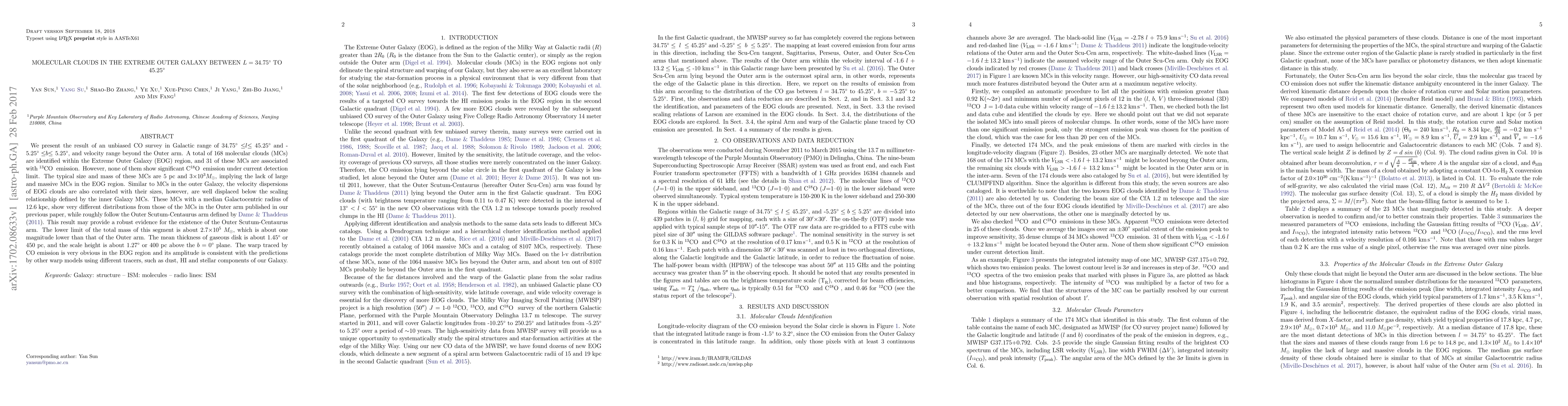 We present the result of an unbiased CO survey in Galactic range of 34.75$^{\circ}\leq$l$\leq$ 45.25$^{\circ}$ and -5.25$^{\circ}\leq$b$\leq$ 5.25$^{\circ}$, and velocity range beyond the Outer arm. A total of 168 molecular clouds (MCs) are identified within the Extreme Outer Galaxy~(EOG) region, and 31 of these MCs are associated with 13CO emission. However, none of them show significant C18O emission under current detection limit. The typical size and mass of these MCs are 5~pc and 3$\times$10$^{3}M_{\sun}$, implying the lack of large and massive MCs in the EOG region. Similar to MCs in the outer Galaxy, the velocity dispersions of EOG clouds are also correlated with their sizes, however, are well displaced below the scaling relationship defined by the inner Galaxy MCs. These MCs with a median Galactocentric radius of 12.6 kpc, show very different distributions from those of the MCs in the Outer arm published in our previous paper, while roughly follow the Outer Scutum-Centaurus arm defined by Dame & Thaddeus 2011. This result may provide a robust evidence for the existence of the Outer Scutum-Centaurus arm. The lower limit of the total mass of this segment is about 2.7$\times$10$^5$ $M_{\sun}$, which is about one magnitude lower than that of the Outer arm. The mean thickness of gaseous disk is about 1.45$^{\circ}$ or 450~pc, and the scale height is about 1.27$^{\circ}$ or 400~pc above the $b=0^{\circ}$ plane. The warp traced by CO emission is very obvious in the EOG region and its amplitude is consistent with the predictions by other warp models using different tracers, such as dust, HI and stellar components of our Galaxy.