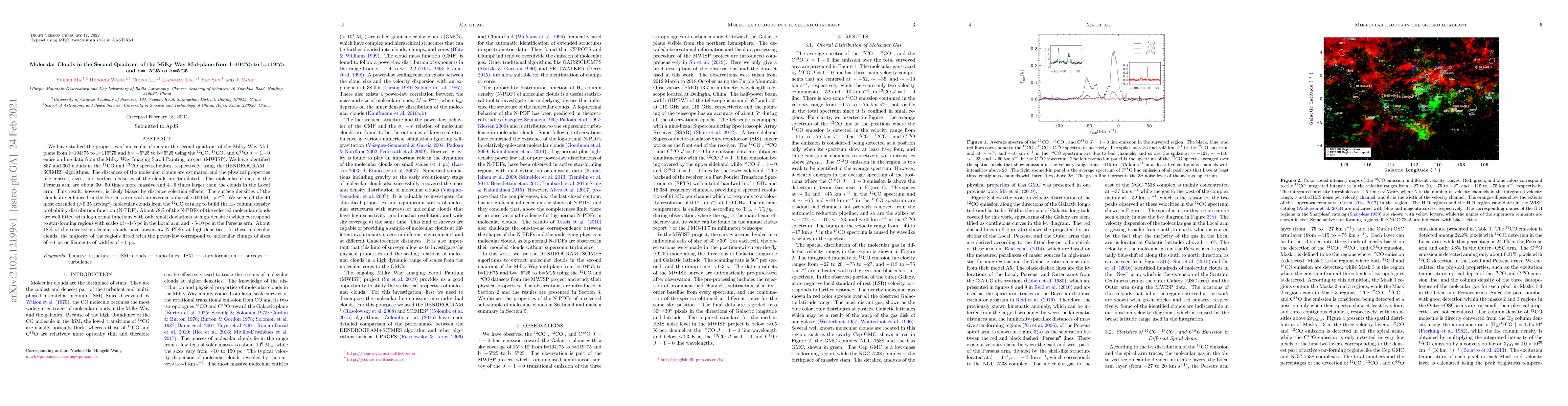 This study analyzes molecular clouds in the Milky Way's second quadrant using $^{12}$CO, $^{13}$CO, and C$^{18}$O data from MWISP, identifying 857 and 300 clouds respectively. The Perseus arm clouds are significantly more massive and larger than those in the Local arm, though distance biases may affect this result. The H$_2$ column density distribution of the most extended clouds shows log-normal behavior in 78% of cases, with deviations in star-forming regions.