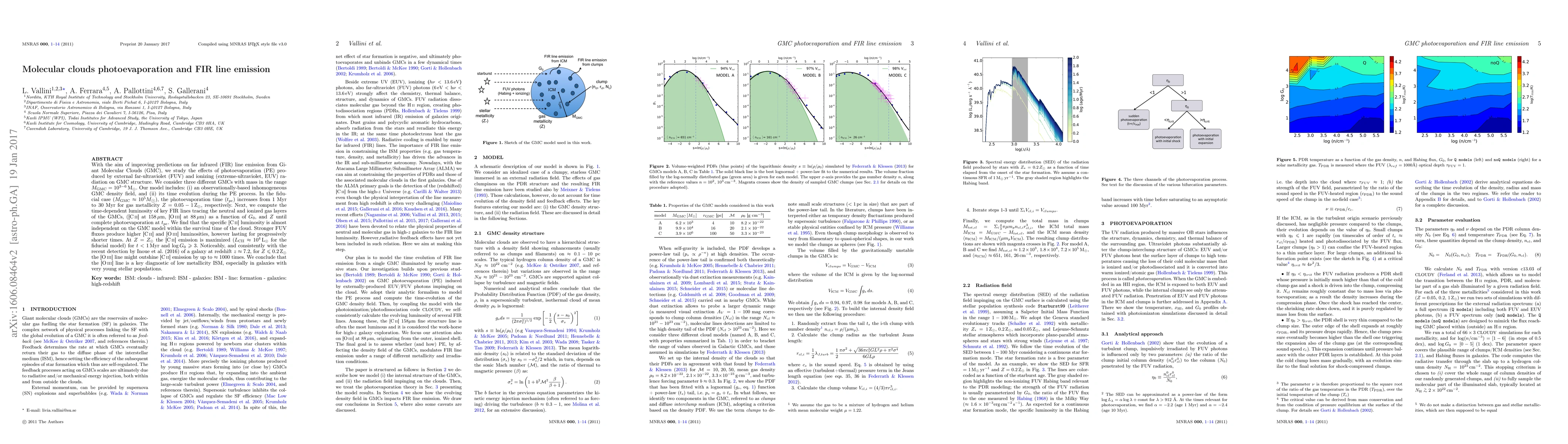 With the aim of improving predictions on far infrared (FIR) line emission from Giant Molecular Clouds (GMC), we study the effects of photoevaporation (PE) produced by external far-ultraviolet (FUV) and ionizing (extreme-ultraviolet, EUV) radiation on GMC structure. We consider three different GMCs with mass in the range $M_{\rm GMC} = 10^{3-6}\,\rm{M_{\odot}}$. Our model includes: (i) an observationally-based inhomogeneous GMC density field, and (ii) its time evolution during the PE process. In the fiducial case ($M_{\rm GMC}\approx10^5 M_{\odot}$), the photoevaporation time ($t_{pe}$) increases from 1 Myr to 30 Myr for gas metallicity $Z=0.05-1\,\rm Z_{\odot}$, respectively. Next, we compute the time-dependent luminosity of key FIR lines tracing the neutral and ionized gas layers of the GMCs, ([CII] at $158\,\rm{\mu m}$, [OIII] at $88\,\rm \mu m$) as a function of $G_0$, and $Z$ until complete photoevaporation at $t_{pe}$. We find that the specific [CII] luminosity is almost independent on the GMC model within the survival time of the cloud. Stronger FUV fluxes produce higher [CII] and [OIII] luminosities, however lasting for progressively shorter times. At $Z=Z_{\odot}$ the [CII] emission is maximized ($L_{\rm CII}\approx 10^4\,\rm{L_{\odot}}$ for the fiducial model) for $t<1\,\rm{Myr}$ and $\log G_0\geq 3$. Noticeably, and consistently with the recent detection by Inoue et al. (2016) of a galaxy at redshift $z\approx 7.2$, for $Z\leq 0.2\,\rm{Z_{\odot}}$ the [OIII] line might outshine [CII] emission by up to $\approx 1000$ times. We conclude that the [OIII] line is a key diagnostic of low metallicity ISM, especially in galaxies with very young stellar populations.