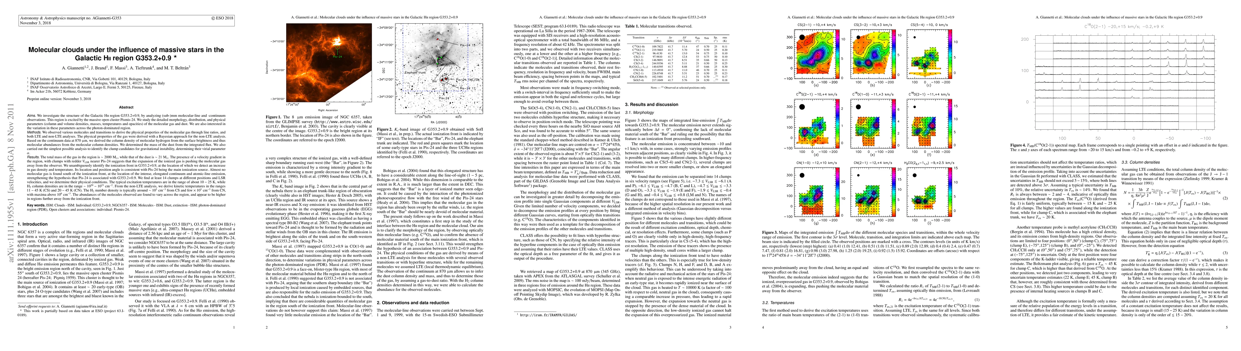 The Galactic HII region G353.2+0.9 is excited by the massive open cluster Pismis-24. By analyzing (sub-)mm molecular-line and -continuum we study the detailed morphology of the gas and dust, as well as their physical parameters and their variation across the PDR. We observed various molecules and transitions to derive the physical properties of the molecular gas through line ratios, and both LTE and non-LTE analyses. The physical properties of the gas were derived with a Bayesian approach for the non-LTE analysis. Based on the continuum data at 870 micron, we derived the dust mass and the column density of H2, and thus the molecular abundances. The total mass of the gas in the region is ca. 2000 Mo, while that of the dust is ca. 21 Mo. A velocity gradient in the region suggests that the expansion of the ionized gas is pushing the molecular gas away from the observer. We unambiguously identify the ionization front, at the location of which we detect an increase in gas density and temperature. We find at least 14 clumps at different positions and LSR velocities. We derive kinetic temperatures in the ranges 11-45 K (CS) and 20-45 K (CN). The H2 number density is typically around 1e5 cm^-3 from CS and few 1e5 cm^-3 from CN, with maxima above 1e6 cm^-3. The abundances of the molecules observed vary across the region, and appear to be higher in regions further away from the ionization front.