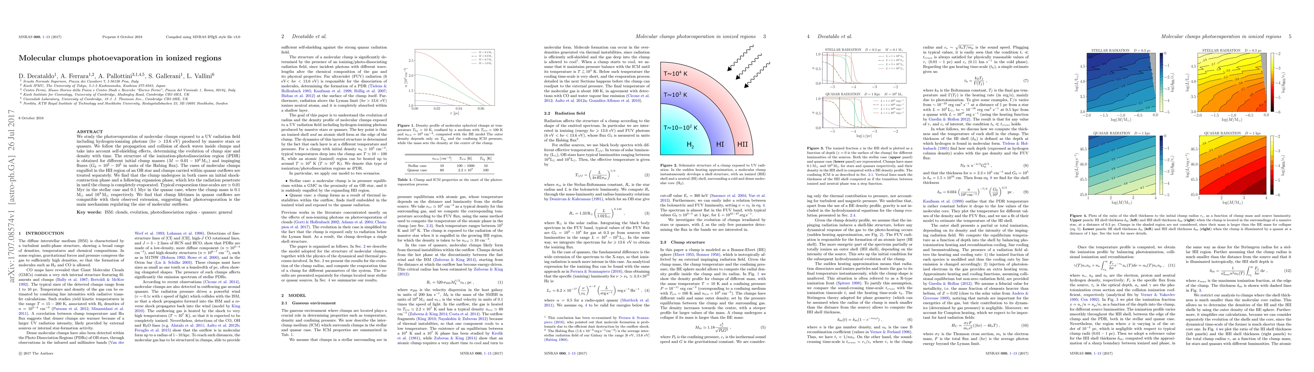 We study the photoevaporation of molecular clumps exposed to a UV radiation field including hydrogen-ionizing photons ($h\nu > 13.6$ eV) produced by massive stars or quasars. We follow the propagation and collision of shock waves inside clumps and take into account self-shielding effects, determining the evolution of clump size and density with time. The structure of the ionization-photodissociation region (iPDR) is obtained for different initial clump masses ($M=0.01 - 10^4\,{\rm M}_\odot$) and impinging fluxes ($G_0=10^2 - 10^5$ in units of the Habing flux). The cases of molecular clumps engulfed in the HII region of an OB star and clumps carried within quasar outflows are treated separately. We find that the clump undergoes in both cases an initial shock-contraction phase and a following expansion phase, which lets the radiation penetrate in until the clump is completely evaporated. Typical evaporation time-scales are $\simeq 0.01$ Myr in the stellar case and 0.1 Myr in the quasar case, where the clump mass is 0.1 ${\rm M}_\odot$ and $10^3\,{\rm M}_\odot$ respectively. We find that clump lifetimes in quasar outflows are compatible with their observed extension, suggesting that photoevaporation is the main mechanism regulating the size of molecular outflows.