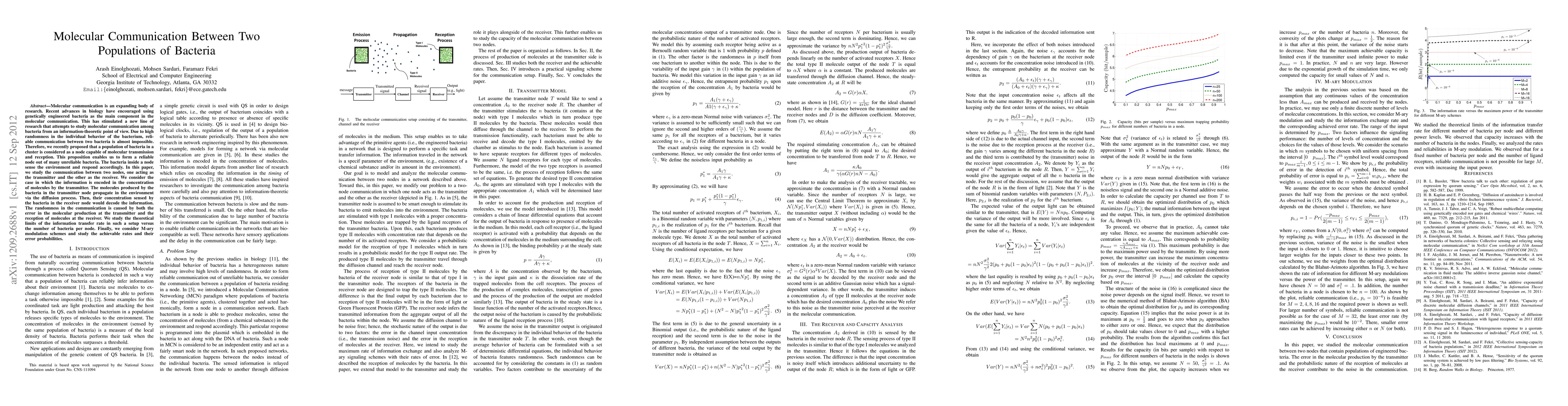 Molecular communication is an expanding body of research. Recent advances in biology have encouraged using genetically engineered bacteria as the main component in the molecular communication. This has stimulated a new line of research that attempts to study molecular communication among bacteria from an information-theoretic point of view. Due to high randomness in the individual behavior of the bacterium, reliable communication between two bacteria is almost impossible. Therefore, we recently proposed that a population of bacteria in a cluster is considered as a node capable of molecular transmission and reception. This proposition enables us to form a reliable node out of many unreliable bacteria. The bacteria inside a node sense the environment and respond accordingly. In this paper, we study the communication between two nodes, one acting as the transmitter and the other as the receiver. We consider the case in which the information is encoded in the concentration of molecules by the transmitter. The molecules produced by the bacteria in the transmitter node propagate in the environment via the diffusion process. Then, their concentration sensed by the bacteria in the receiver node would decode the information. The randomness in the communication is caused by both the error in the molecular production at the transmitter and the reception of molecules at the receiver. We study the theoretical limits of the information transfer rate in such a setup versus the number of bacteria per node. Finally, we consider M-ary modulation schemes and study the achievable rates and their error probabilities.