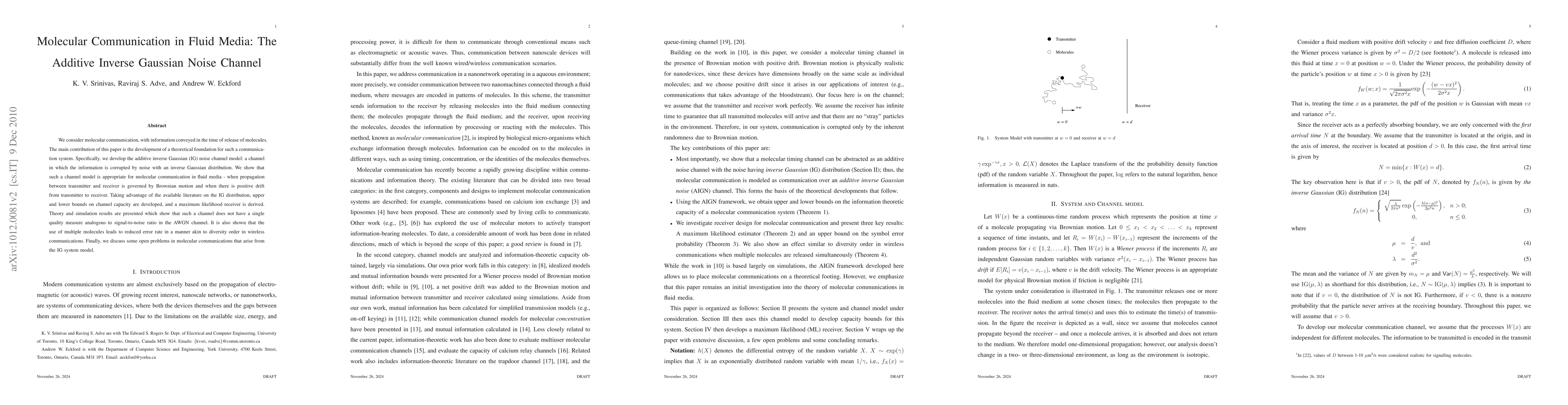 This paper develops a theoretical foundation for molecular communication using an additive inverse Gaussian (IG) noise channel model, showing its suitability for fluid media with Brownian motion. It derives upper and lower bounds on channel capacity and discusses the benefits of using multiple molecules for error reduction.