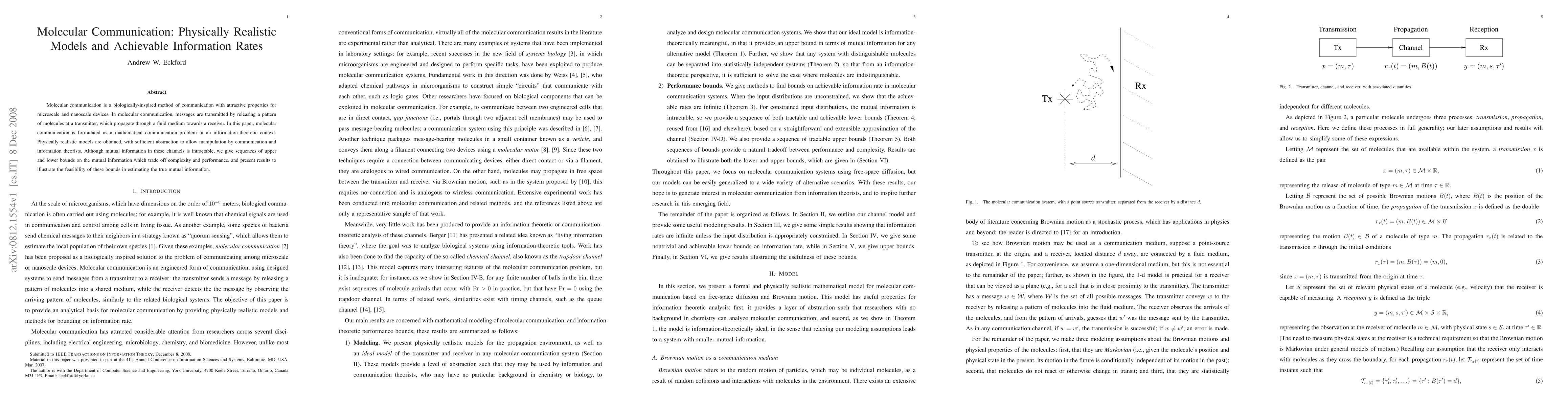 This paper formulates molecular communication as a mathematical problem within information theory, developing physically realistic models and providing achievable information rates. It presents sequences of upper and lower bounds on mutual information, demonstrating their feasibility in estimating true mutual information.