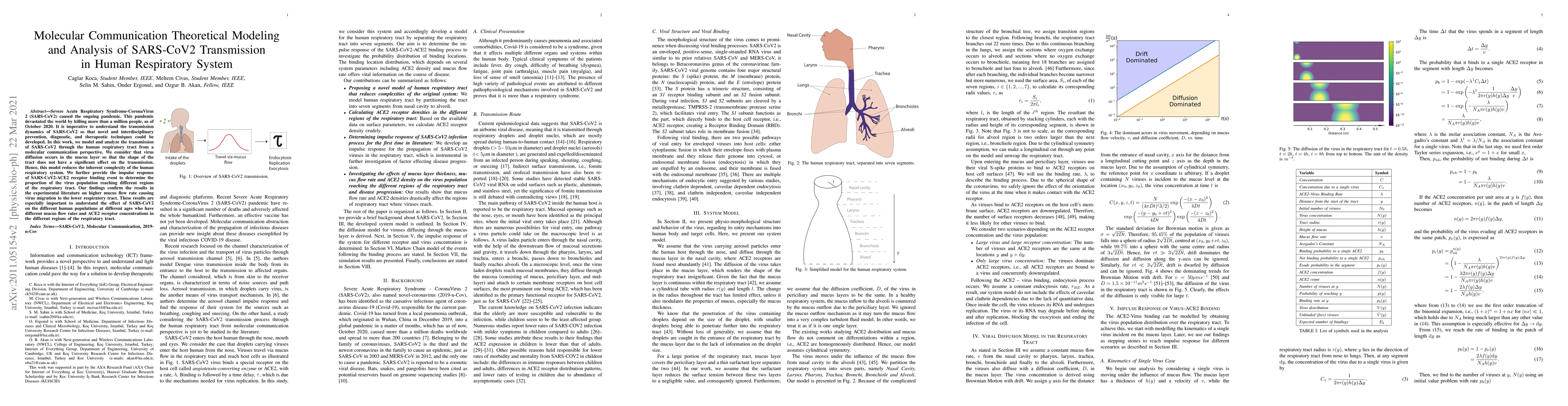 Severe Acute Respiratory Syndrome-CoronaVirus 2 (SARS-CoV2) caused the ongoing pandemic. This pandemic devastated the world by killing more than a million people, as of October 2020. It is imperative to understand the transmission dynamics of SARS-CoV2 so that novel and interdisciplinary prevention, diagnostic, and therapeutic techniques could be developed. In this work, we model and analyze the transmission of SARS-CoV2 through the human respiratory tract from a molecular communication perspective. We consider that virus diffusion occurs in the mucus layer so that the shape of the tract does not have a significant effect on the transmission. Hence, this model reduces the inherent complexity of the human respiratory system. We further provide the impulse response of SARS-CoV2-ACE2 receptor binding event to determine the proportion of the virus population reaching different regions of the respiratory tract. Our findings confirm the results in the experimental literature on higher mucus flow rate causing virus migration to the lower respiratory tract. These results are especially important to understand the effect of SARS-CoV2 on the different human populations at different ages who have different mucus flow rates and ACE2 receptor concentrations in the different regions of the respiratory tract.