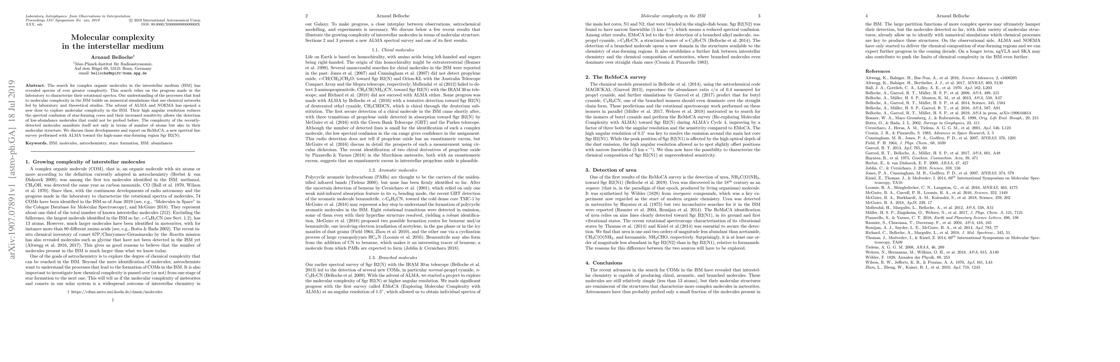 The search for complex organic molecules in the interstellar medium (ISM) has revealed species of ever greater complexity. This search relies on the progress made in the laboratory to characterize their rotational spectra. Our understanding of the processes that lead to molecular complexity in the ISM builds on numerical simulations that use chemical networks fed by laboratory and theoretical studies. The advent of ALMA and NOEMA has opened a new door to explore molecular complexity in the ISM. Their high angular resolution reduces the spectral confusion of star-forming cores and their increased sensitivity allows the detection of low-abundance molecules that could not be probed before. The complexity of the recently-detected molecules manifests itself not only in terms of number of atoms but also in their molecular structure. We discuss these developments and report on ReMoCA, a new spectral line survey performed with ALMA toward the high-mass star-forming region Sgr B2(N).