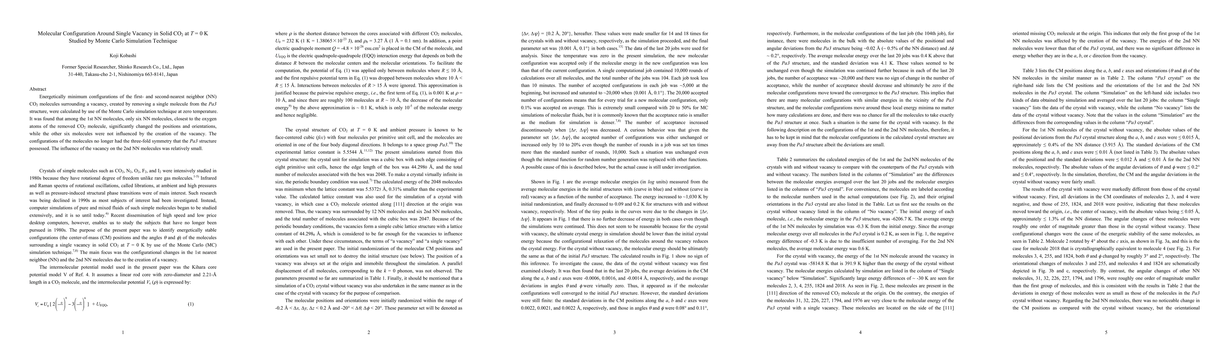 Energetically minimum configurations of the first- and second-nearest neighbor (NN) CO2 molecules surrounding a vacancy, created by removing a single molecule from the Pa3 structure, were calculated by use of the Monte Carlo simulation technique at zero temperature. It was found that among the 1st NN molecules, only six NN molecules, closest to the oxygen atoms of the removed CO2 molecule, significantly changed the positions and orientations, while the other six molecules were not influenced by the creation of the vacancy. The configurations of the molecules no longer had the three-fold symmetry that the Pa3 structure possessed. The influence of the vacancy on the 2nd NN molecules was relatively small.