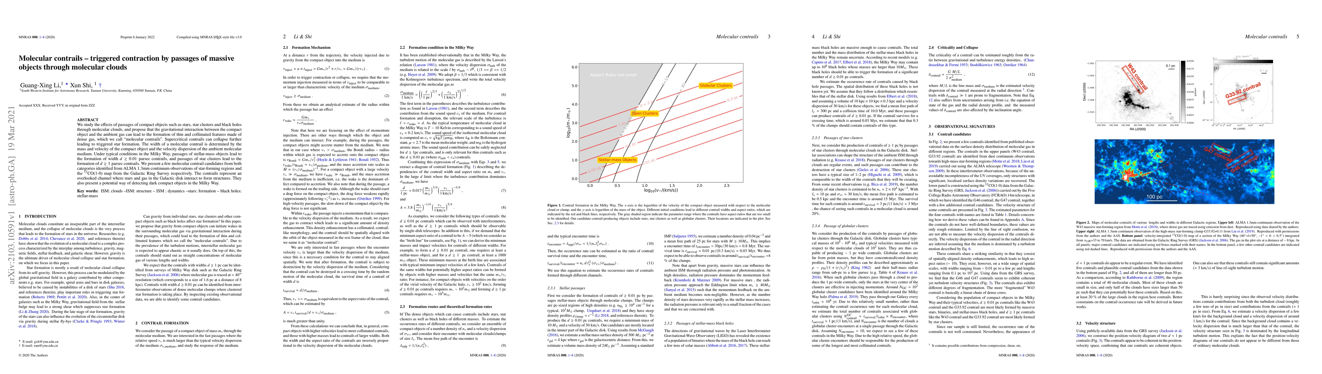 The research proposes 'molecular contrails' formed by gravitational interactions of massive objects (like stars, star clusters, and black holes) passing through molecular clouds. These contrails, narrow and dense, can trigger star formation. Identified from ALMA and Galactic Ring Survey data, they suggest a new mechanism for disk interactions and potential detection of dark compact objects in the Milky Way.