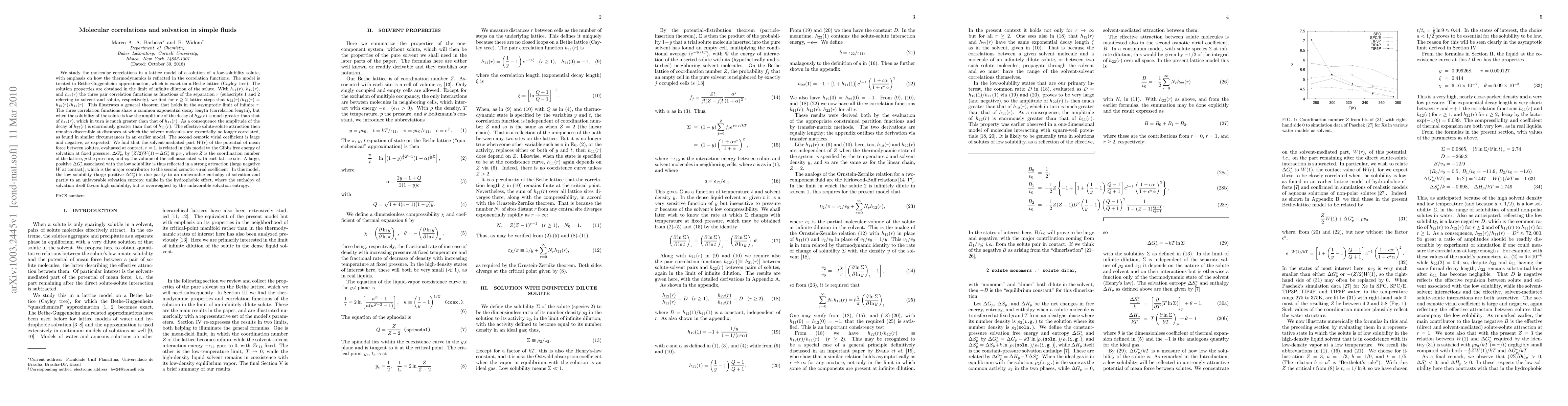 We study the molecular correlations in a lattice model of a solution of a low-solubility solute, with emphasis on how the thermodynamics is reflected in the correlation functions. The model is treated in Bethe-Guggenheim approximation, which is exact on a Bethe lattice (Cayley tree). The solution properties are obtained in the limit of infinite dilution of the solute. With $h_{11}(r)$, $h_{12}(r)$, and $h_{22}(r)$ the three pair correlation functions as functions of the separation $r$ (subscripts 1 and 2 referring to solvent and solute, respectively), we find for $r \geq 2$ lattice steps that $h_{22}(r)/h_{12}(r) \equiv h_{12}(r)/h_{11}(r)$. This illustrates a general theorem that holds in the asymptotic limit of infinite $r$. The three correlation functions share a common exponential decay length (correlation length), but when the solubility of the solute is low the amplitude of the decay of $h_{22}(r)$ is much greater than that of $h_{12}(r)$, which in turn is much greater than that of $h_{11}(r)$. As a consequence the amplitude of the decay of $h_{22}(r)$ is enormously greater than that of $h_{11}(r)$. The effective solute-solute attraction then remains discernible at distances at which the solvent molecules are essentially no longer correlated, as found in similar circumstances in an earlier model. The second osmotic virial coefficient is large and negative, as expected. We find that the solvent-mediated part $W(r)$ of the potential of mean force between solutes, evaluated at contact, $r=1$, is related in this model to the Gibbs free energy of solvation at fixed pressure, $\Delta G_p^*$, by $(Z/2) W(1) + \Delta G_p^* \equiv p v_0$, where $Z$ is the coordination number of the lattice, $p$ the pressure, and $v_0$ the volume of the cell associated with each lattice site. A large, positive $\Delta G_p^*$ associated with the low solubility is thus reflected in a strong attraction (large negative $W$ at contact), which is the major contributor to the second osmotic virial coefficient. In this model, the low solubility (large positive $\Delta G_p^*$) is due partly to an unfavorable enthalpy of solvation and partly to an unfavorable solvation entropy, unlike in the hydrophobic effect, where the enthalpy of solvation itself favors high solubility, but is overweighed by the unfavorable solvation entropy.