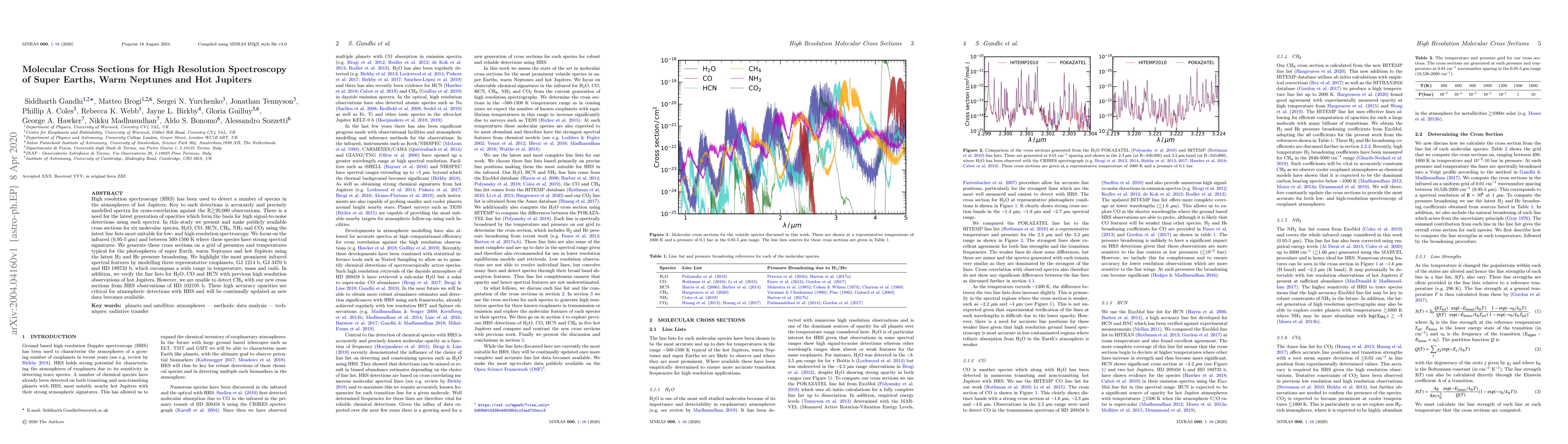 This paper presents high-resolution spectroscopy cross sections for six key molecular species (H$_2$O, CO, HCN, CH$_4$, NH$_3$, and CO$_2$) for exoplanet atmospheres, focusing on infrared wavelengths and temperatures typical for super Earths, warm Neptunes, and hot Jupiters. The cross sections are verified against previous observations and will aid in future high signal-to-noise detections, although CH$_4$ remains undetectable with the new data.
