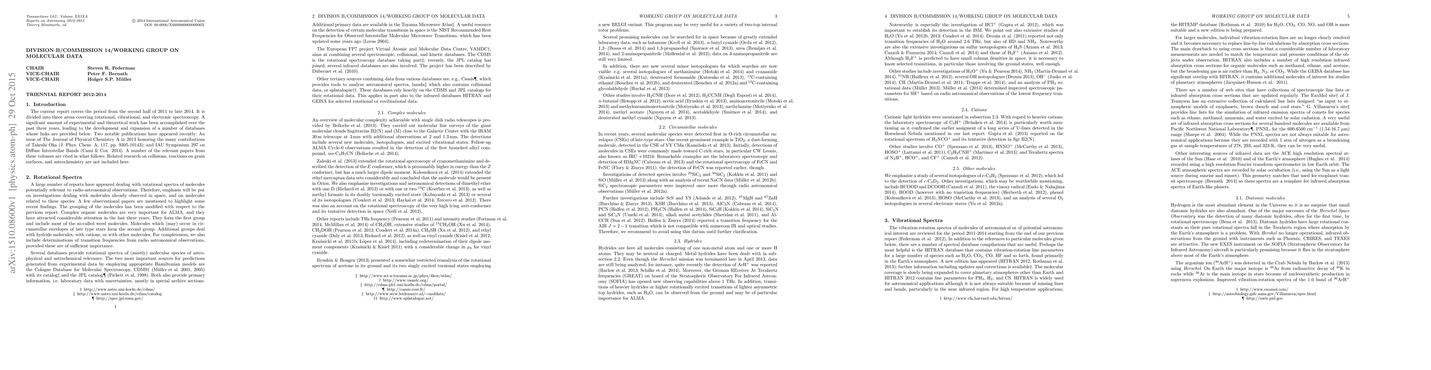 The current report covers the period from the second half of 2011 to late 2014. It is divided into three areas covering rotational, vibrational, and electronic spectroscopy. A signifcant amount of experimental and theoretical work has been accomplished over the past three years, leading to the development and expansion of a number of databases whose links are provided below. Two notable publications have appeared recently: An issue of The Journal of Physical Chemistry A in 2013 honoring the many contributions of Takeshi Oka (J. Phys. Chem. A, 117, pp. 9305-10143); and IAU Symposium 297 on Diffuse Interstellar Bands. A number of the relevant papers from these volumes are cited. Related research on collisions, reactions on grain surfaces, and astrochemistry are not included here.