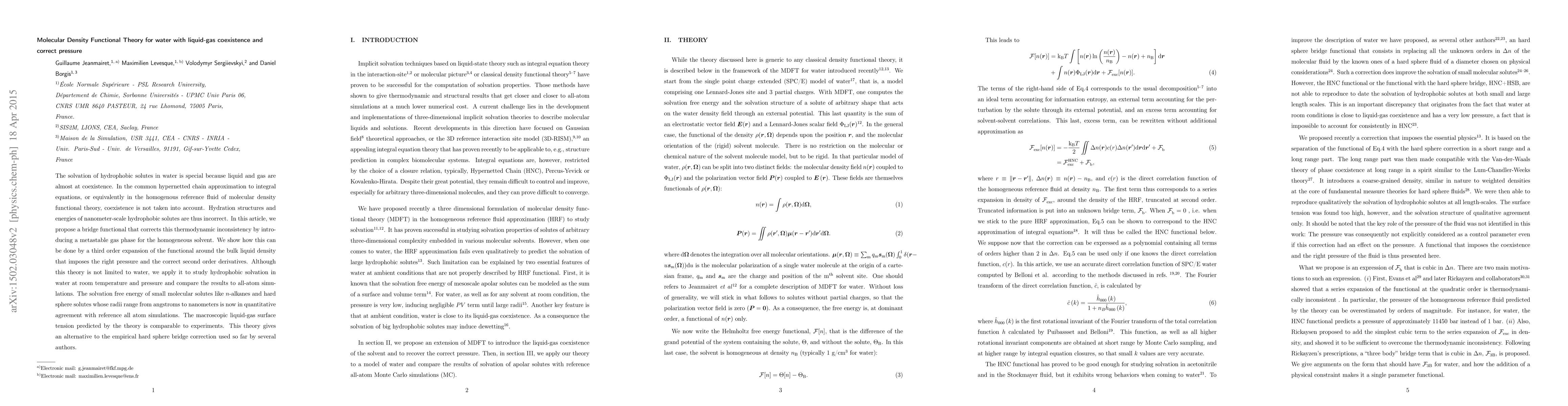 This paper proposes a bridge functional in molecular density functional theory to correct thermodynamic inconsistencies in solvation of hydrophobic solutes in water, introducing a metastable gas phase. The method provides accurate hydration free energies and structures for small solutes, comparable to all-atom simulations, and predicts liquid-gas surface tension in line with experimental data.