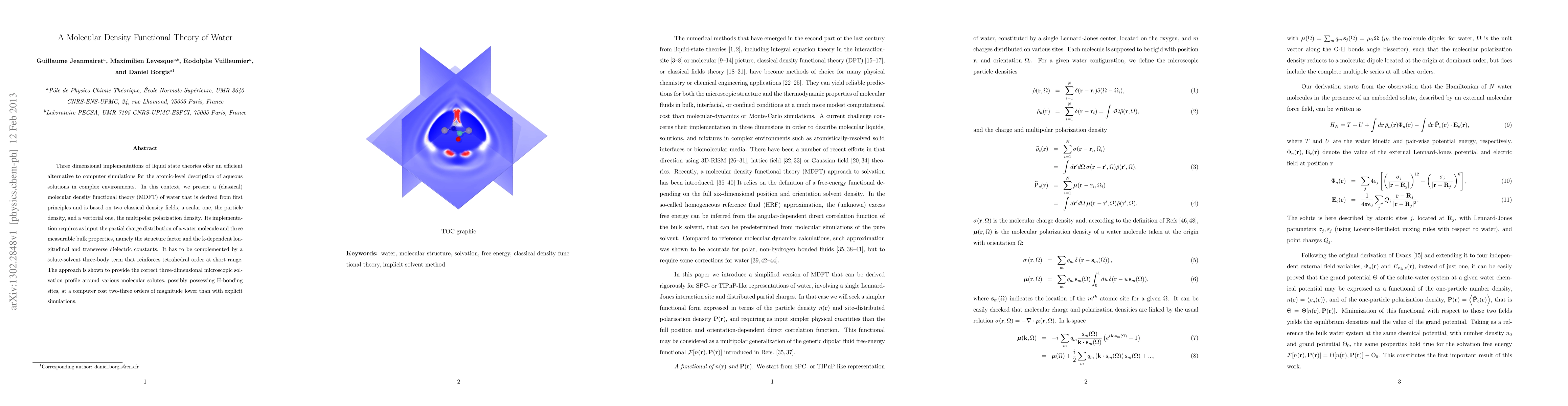 The research presents a classical molecular density functional theory (MDFT) of water derived from first principles, utilizing two classical density fields: particle density and multipolar polarization density. It requires partial charge distribution of a water molecule and three measurable bulk properties as inputs, and must be complemented by a solute-solvent three-body term to reinforce tetrahedral order at short range.