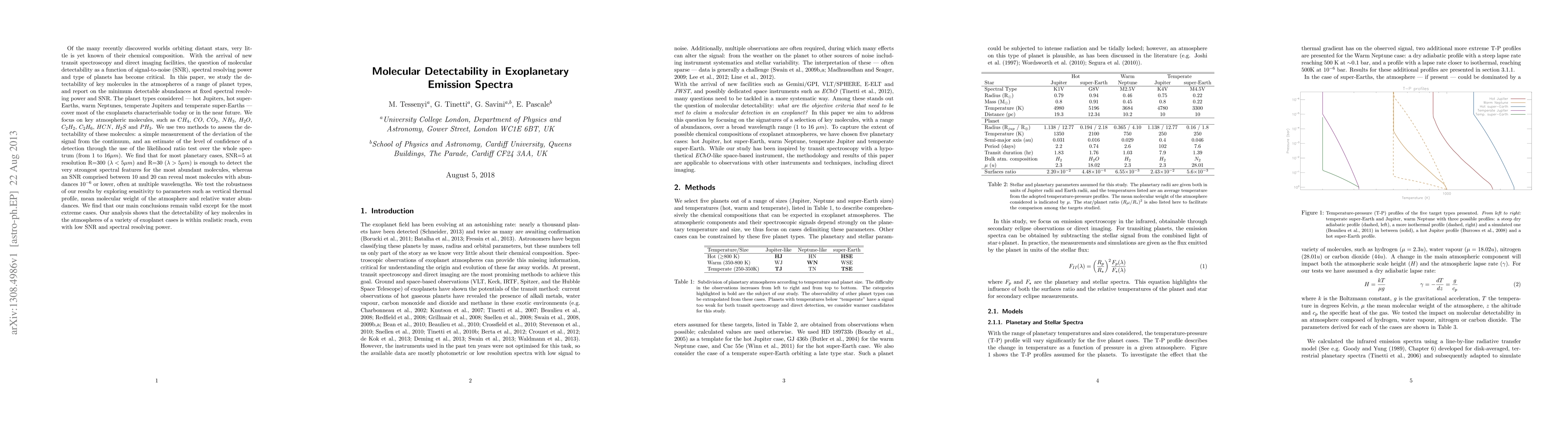 Of the many recently discovered worlds orbiting distant stars, very little is yet known of their chemical composition. With the arrival of new transit spectroscopy and direct imaging facilities, the question of molecular detectability as a function of signal-to-noise (SNR), spectral resolving power and type of planets has become critical. In this paper, we study the detectability of key molecules in the atmospheres of a range of planet types, and report on the minimum detectable abundances at fixed spectral resolving power and SNR. The planet types considered - hot Jupiters, hot super-Earths, warm Neptunes, temperate Jupiters and temperate super-Earths - cover most of the exoplanets characterisable today or in the near future. We focus on key atmospheric molecules, such as CH4, CO, CO2, NH3, H2O, C2H2, C2H6, HCN, H2S and PH3. We use two methods to assess the detectability of these molecules: a simple measurement of the deviation of the signal from the continuum, and an estimate of the level of confidence of a detection through the use of the likelihood ratio test over the whole spectrum (from 1 to 16$\mu m$). We find that for most planetary cases, SNR=5 at resolution R=300 ($\lambda < 5\mu m$) and R=30 ($\lambda > 5\mu m$) is enough to detect the very strongest spectral features for the most abundant molecules, whereas an SNR comprised between 10 and 20 can reveal most molecules with abundances 10^-6 or lower, often at multiple wavelengths. We test the robustness of our results by exploring sensitivity to parameters such as vertical thermal profile, mean molecular weight of the atmosphere and relative water abundances. We find that our main conclusions remain valid except for the most extreme cases. Our analysis shows that the detectability of key molecules in the atmospheres of a variety of exoplanet cases is within realistic reach, even with low SNR and spectral resolving power.