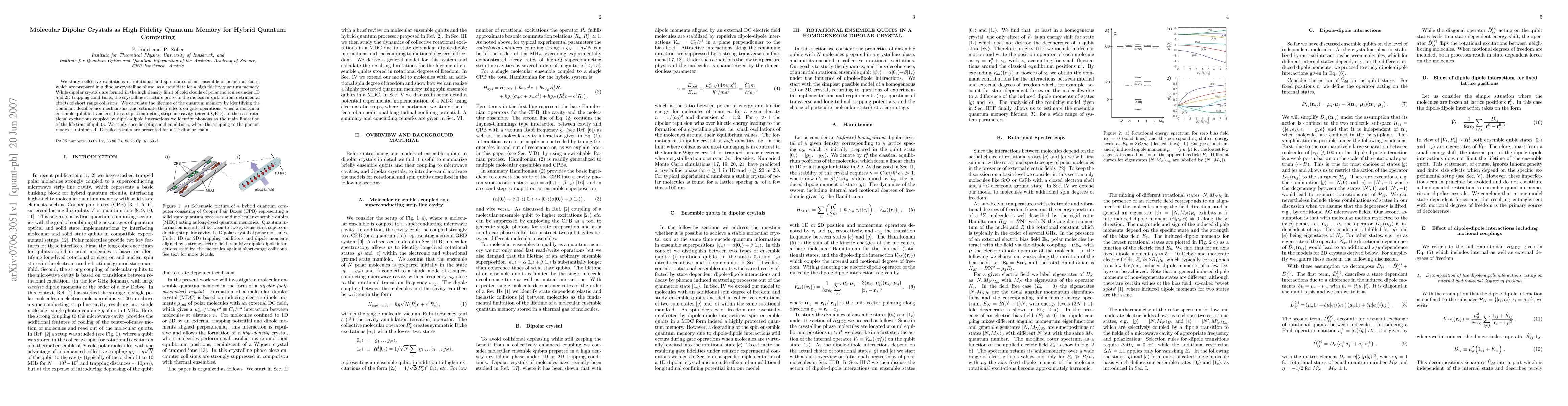 We study collective excitations of rotational and spin states of an ensemble of polar molecules, which are prepared in a dipolar crystalline phase, as a candidate for a high fidelity quantum memory. While dipolar crystals are formed in the high density limit of cold clouds of polar molecules under 1D and 2D trapping conditions, the crystalline structure protects the molecular qubits from detrimental effects of short range collisions. We calculate the lifetime of the quantum memory by identifying the dominant decoherence mechanisms, and estimate their effects on gate operations, when a molecular ensemble qubit is transferred to a superconducting strip line cavity (circuit QED). In the case rotational excitations coupled by dipole-dipole interactions we identify phonons as the main limitation of the life time of qubits. We study specific setups and conditions, where the coupling to the phonon modes is minimized. Detailed results are presented for a 1D dipolar chain.