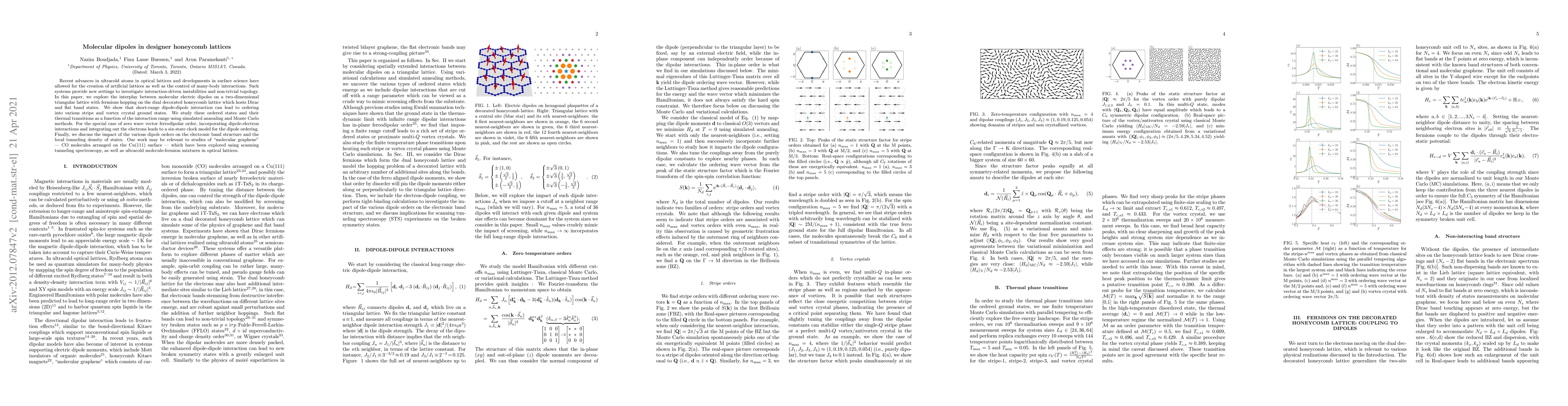 Recent advances in ultracold atoms in optical lattices and developments in surface science have allowed for the creation of artificial lattices as well as the control of many-body interactions. Such systems provide new settings to investigate interaction-driven instabilities and non-trivial topology. In this paper, we explore the interplay between molecular electric dipoles on a two-dimensional triangular lattice with fermions hopping on the dual decorated honeycomb lattice which hosts Dirac and flat band states. We show that short-range dipole-dipole interaction can lead to ordering into various stripe and vortex crystal ground states. We study these ordered states and their thermal transitions as a function of the interaction range using simulated annealing and Monte Carlo methods. For the special case of zero wave vector ferrodipolar order, incorporating dipole-electron interactions and integrating out the electrons leads to a six-state clock model for the dipole ordering. Finally, we discuss the impact of the various dipole orders on the electronic band structure and the local tunneling density of states. Our work may be relevant to studies of "molecular graphene" -- CO molecules arranged on the Cu(111) surface -- which have been explored using scanning tunneling spectroscopy, as well as ultracold molecule-fermion mixtures in optical lattices.