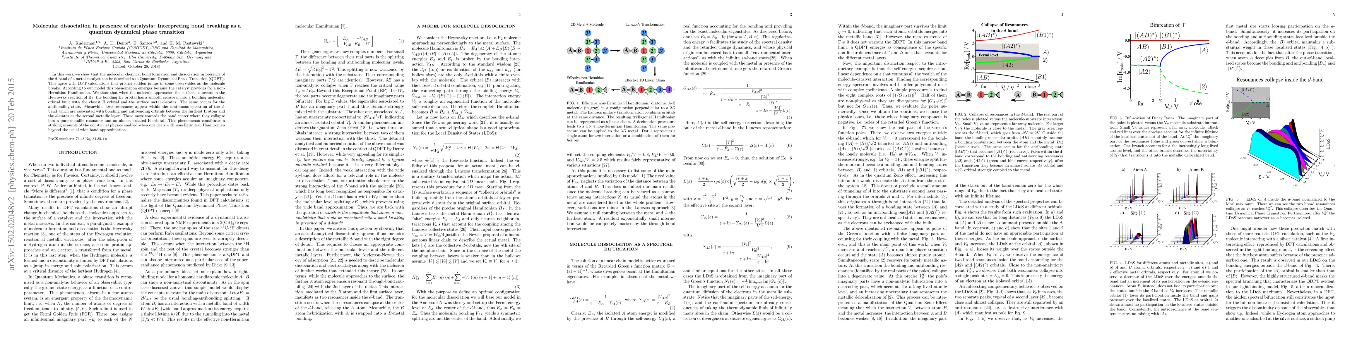 In this work we show that the molecular chemical bond formation and dissociation in presence of the d-band of a metal catalyst can be described as a Quantum Dynamical Phase Transition (QDPT). This agree with DFT calculations that predict sudden jumps in some observables as the molecule breaks. According to our model this phenomenon emerges because the catalyst provides for a non- Hermitian Hamiltonian. We show that when the molecule approaches the surface, as occurs in the Heyrovsky reaction of H 2, the bonding H 2 orbital has a smooth crossover into a bonding molecular orbital built with the closest H orbital and the surface metal d-states. The same occurs for the antibonding state. Meanwhile, two resonances appear within the continuous spectrum of the d- band which are associated with bonding and antibonding orbitals between the furthest H atom and the d-states at the second metallic layer. These move towards the band center where they collapse into a pure metallic resonance and an almost isolated H orbital. This phenomenon constitutes a striking example of the non-trivial physics enabled when one deals with non-Hermitian Hamiltonian beyond the usual wide band approximation.