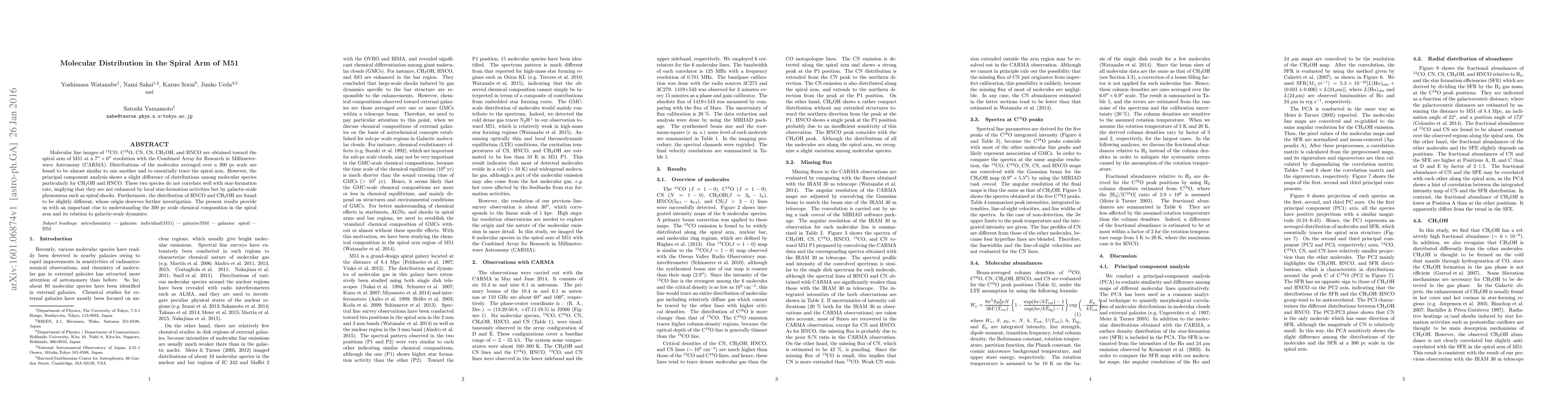Molecular line images of 13CO, C18O, CN, CS, CH3OH, and HNCO are obtained toward the spiral arm of M51 at a 7" times 6" resolution with the Combined Array for Research in Millimeter-wave Astronomy (CARMA). Distributions of the molecules averaged over a 300 pc scale are found to be almost similar to one another and to essentially trace the spiral arm. However, the principal component analysis shows a slight difference of distributions among molecular species particularly for CH3OH and HNCO. These two species do not correlate well with star-formation rate, implying that they are not enhanced by local star-formation activities but by galactic-scale phenomena such as spiral shocks. Furthermore, the distribution of HNCO and CH3OH are found to be slightly different, whose origin deserves further investigation. The present results provide us with an important clue to understanding the 300 pc scale chemical composition in the spiral arm and its relation to galactic-scale dynamics.