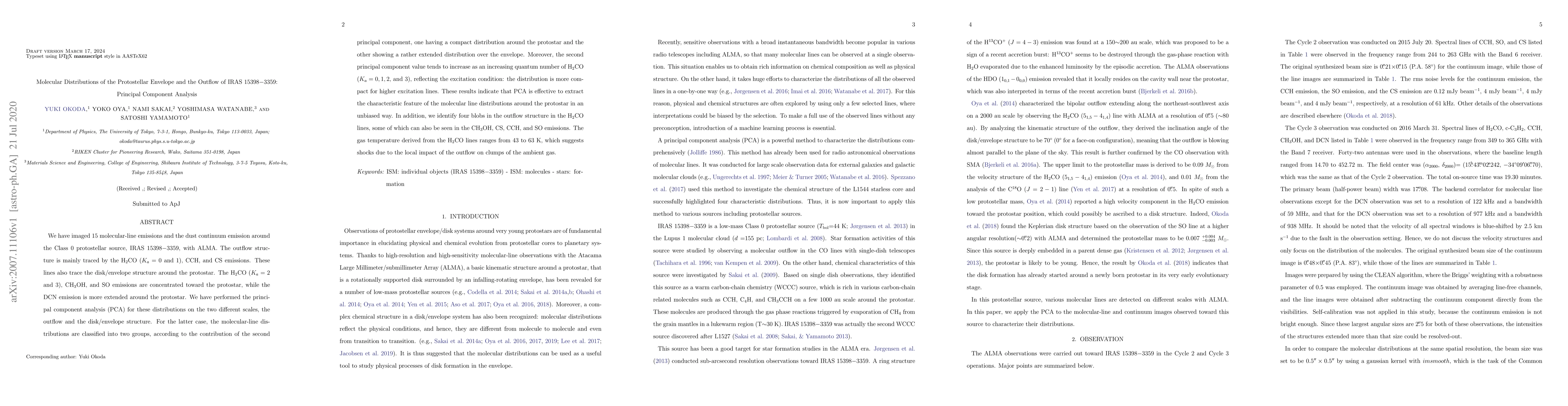 We have imaged 15 molecular-line emissions and the dust continuum emission around the Class 0 protostellar source, IRAS 15398-3359, with ALMA. The outflow structure is mainly traced by the H2CO (K_a=0 and 1), CCH, and CS emissions. These lines also trace the disk/envelope structure around the protostar. The H2CO (K_a=2 and 3), CH3OH, and SO emissions are concentrated toward the protostar, while the DCN emission is more extended around the protostar. We have performed the principal component analysis (PCA) for these distributions on the two different scales, the outflow and the disk/envelope structure. For the latter case, the molecular-line distributions are classified into two groups, according to the contribution of the second principal component, one having a compact distribution around the protostar and the other showing a rather extended distribution over the envelope. Moreover, the second principal component value tends to increase as an increasing quantum number of H2CO (K_a=0,1,2, and 3), reflecting the excitation condition: the distribution is more compact for higher excitation lines. These results indicate that PCA is effective to extract the characteristic feature of the molecular line distributions around the protostar in an unbiased way. In addition, we identify four blobs in the outflow structure in the H2CO lines, some of which can also be seen in the CH3OH, CS, CCH, and SO emissions. The gas temperature derived from the H2CO lines ranges from 43 to 63 K, which suggests shocks due to the local impact of the outflow on clumps of the ambient gas.