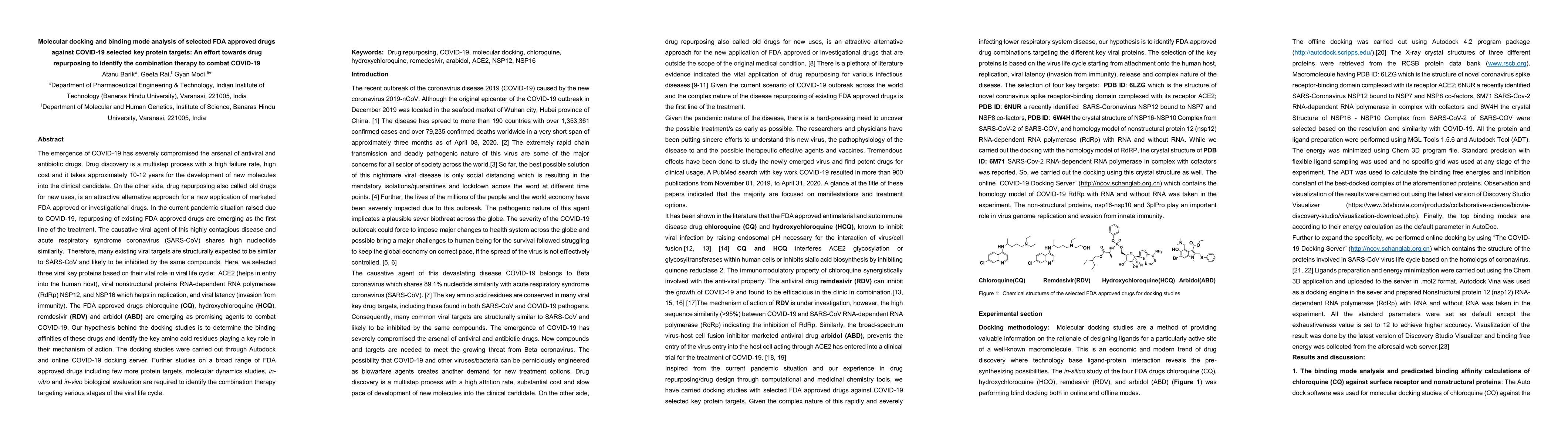 This study explores the potential of FDA-approved drugs like chloroquine, hydroxychloroquine, remdesivir, and arbidol for repurposing against COVID-19 by molecular docking against key viral proteins: ACE2, RdRp NSP12, and NSP16. The aim is to identify effective combination therapies by analyzing the binding affinities and key residues involved.