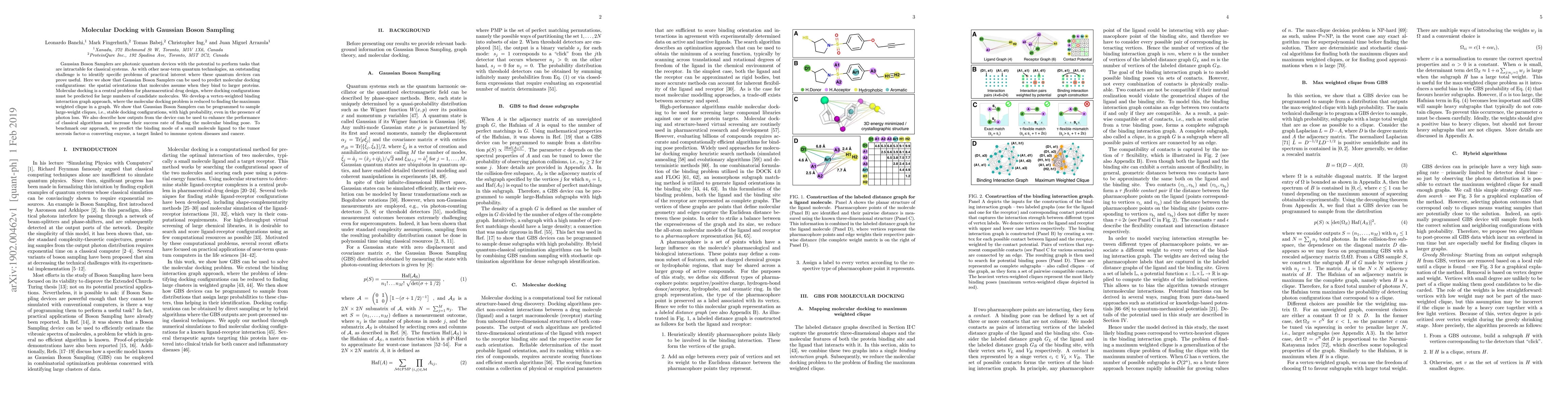 Gaussian Boson Samplers are photonic quantum devices with the potential to perform tasks that are intractable for classical systems. As with other near-term quantum technologies, an outstanding challenge is to identify specific problems of practical interest where these quantum devices can prove useful. Here we show that Gaussian Boson Samplers can be used to predict molecular docking configurations: the spatial orientations that molecules assume when they bind to larger proteins. Molecular docking is a central problem for pharmaceutical drug design, where docking configurations must be predicted for large numbers of candidate molecules. We develop a vertex-weighted binding interaction graph approach, where the molecular docking problem is reduced to finding the maximum weighted clique in a graph. We show that Gaussian Boson Samplers can be programmed to sample large-weight cliques, i.e., stable docking configurations, with high probability, even in the presence of photon loss. We also describe how outputs from the device can be used to enhance the performance of classical algorithms and increase their success rate of finding the molecular binding pose. To benchmark our approach, we predict the binding mode of a small molecule ligand to the tumor necrosis factor-${\alpha}$ converting enzyme, a target linked to immune system diseases and cancer.