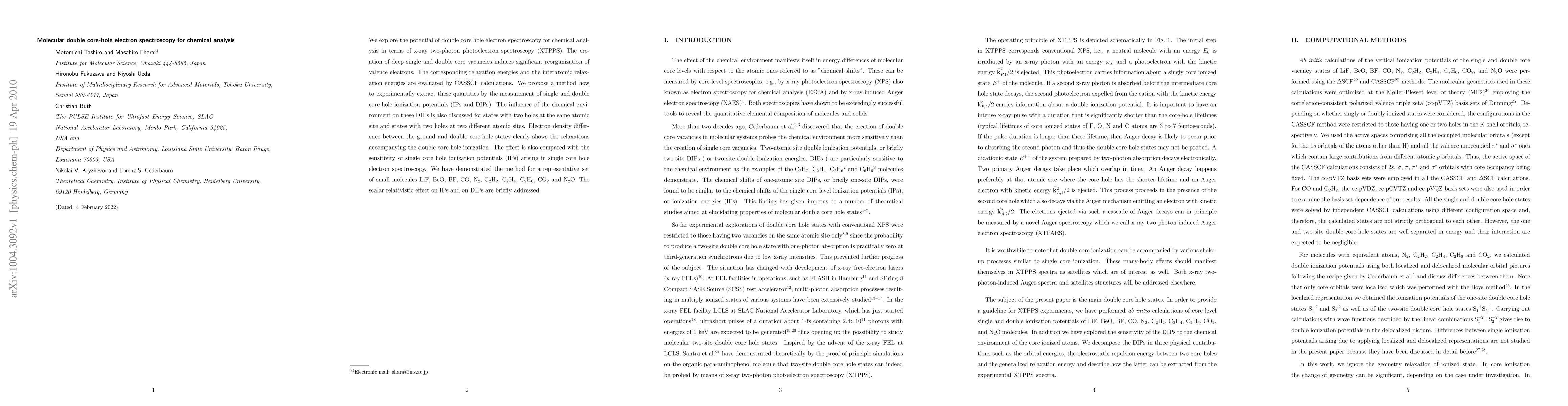 This paper investigates double core-hole electron spectroscopy for chemical analysis using x-ray two-photon photoelectron spectroscopy (XTPPS) and demonstrates its potential through calculations and experiments on small molecules. The study reveals significant reorganization of valence electrons due to double core-hole ionization and proposes a method to extract relaxation energies from ionization potentials.