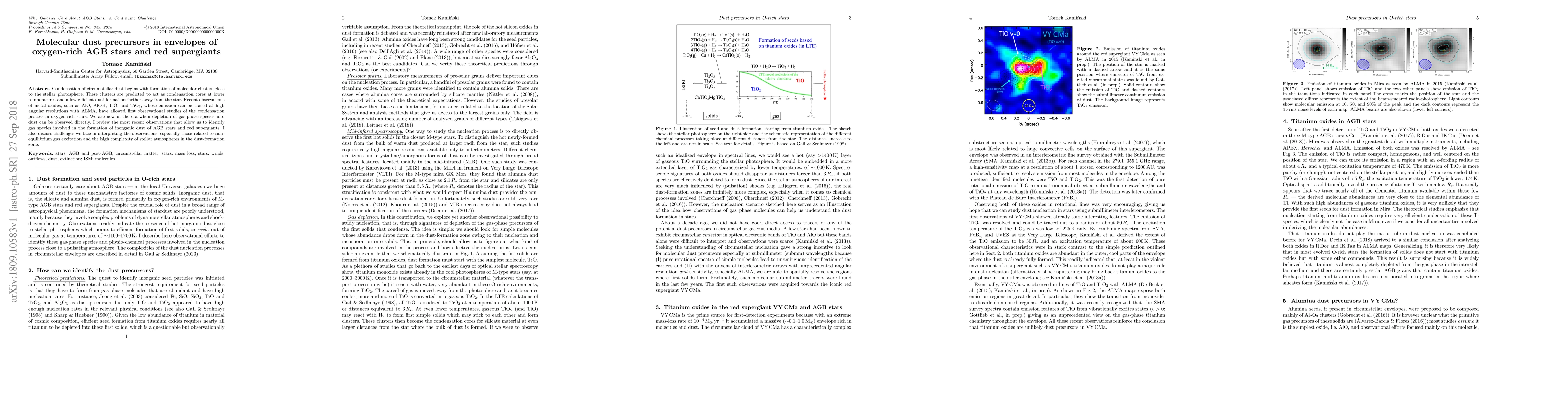This paper reviews recent observations of molecular dust precursors in oxygen-rich AGB stars and red supergiants, focusing on the condensation process starting near the stellar photosphere. It highlights the detection of metal oxides like AlO and TiO$_2$ and discusses challenges in interpreting these observations due to non-equilibrium gas excitation and complex stellar atmospheres.