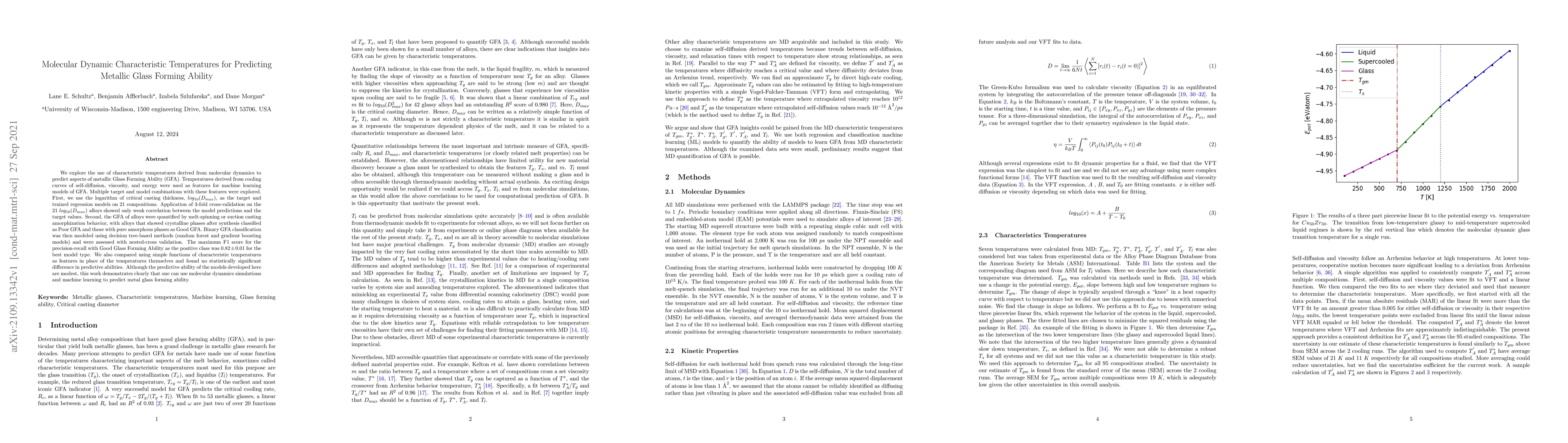 We explore the use of characteristic temperatures derived from molecular dynamics to predict aspects of metallic Glass Forming Ability (GFA). Temperatures derived from cooling curves of self-diffusion, viscosity, and energy were used as features for machine learning models of GFA. Multiple target and model combinations with these features were explored. First, we use the logarithm of critical casting thickness, $log_{10}(D_{max})$, as the target and trained regression models on 21 compositions. Application of 3-fold cross-validation on the 21 $log_{10}(D_{max})$ alloys showed only weak correlation between the model predictions and the target values. Second, the GFA of alloys were quantified by melt-spinning or suction casting amorphization behavior, with alloys that showed crystalline phases after synthesis classified as Poor GFA and those with pure amorphous phases as Good GFA. Binary GFA classification was then modeled using decision tree-based methods (random forest and gradient boosting models) and were assessed with nested-cross validation. The maximum F1 score for the precision-recall with Good Glass Forming Ability as the positive class was $0.82 \pm 0.01$ for the best model type. We also compared using simple functions of characteristic temperatures as features in place of the temperatures themselves and found no statistically significant difference in predictive abilities. Although the predictive ability of the models developed here are modest, this work demonstrates clearly that one can use molecular dynamics simulations and machine learning to predict metal glass forming ability.