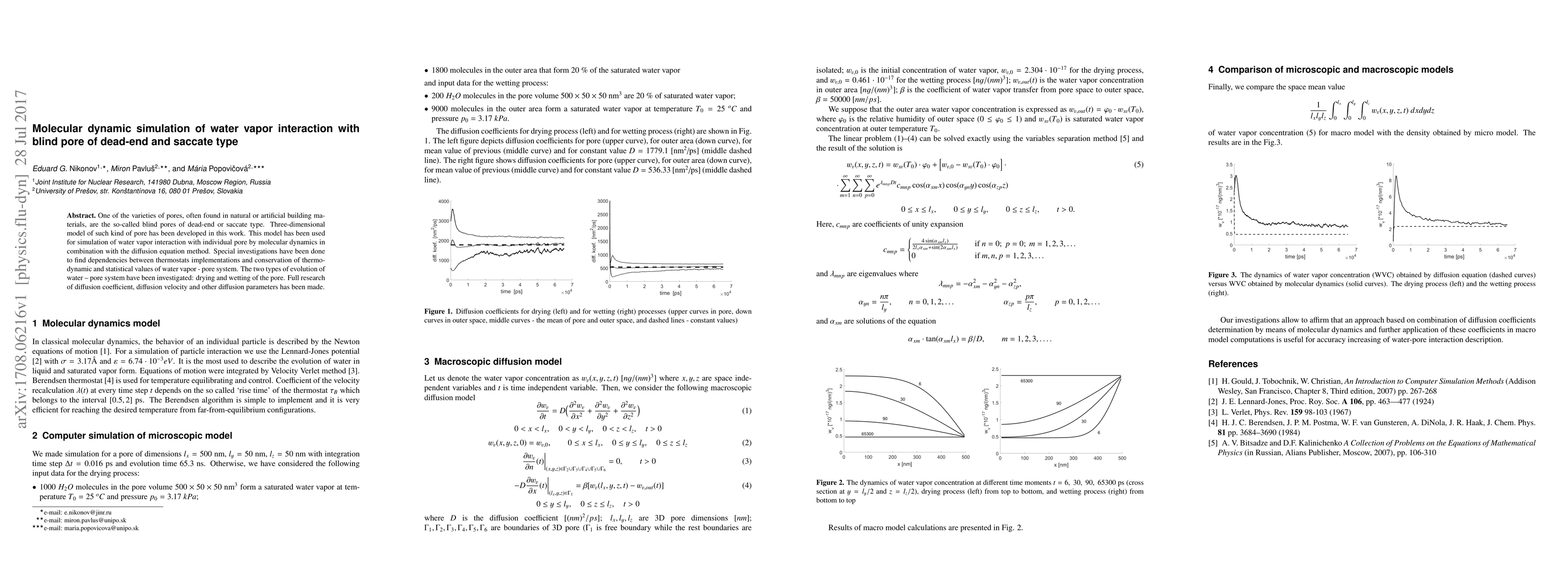 One of the varieties of pores, often found in natural or artificial building materials, are the so-called blind pores of dead-end or saccate type. Three-dimensional model of such kind of pore has been developed in this work. This model has been used for simulation of water vapor interaction with individual pore by molecular dynamics in combination with the diffusion equation method. Special investigations have been done to find dependencies between thermostats implementations and conservation of thermodynamic and statistical values of water vapor - pore system. The two types of evolution of water-pore system have been investigated: drying and wetting of the pore. Full research of diffusion coefficient, diffusion velocity and other diffusion parameters has been made.