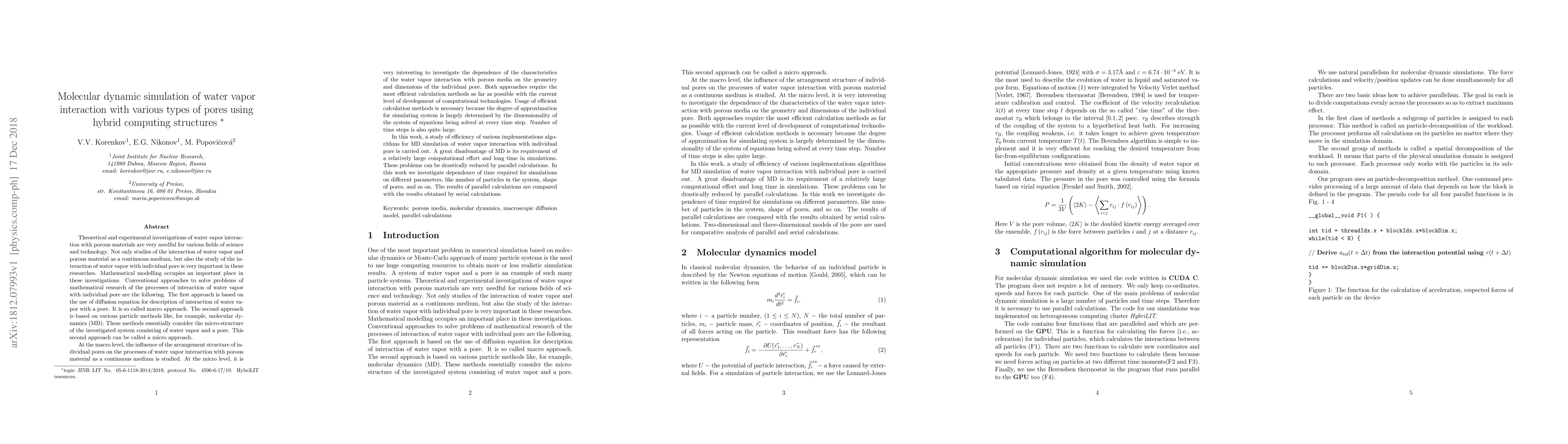 This paper investigates the efficiency of molecular dynamic (MD) simulations for modeling water vapor interaction with various pore types using hybrid computing structures. The study compares the performance of parallel versus serial calculations, analyzing the impact of parameters like particle count and pore shape on simulation time.