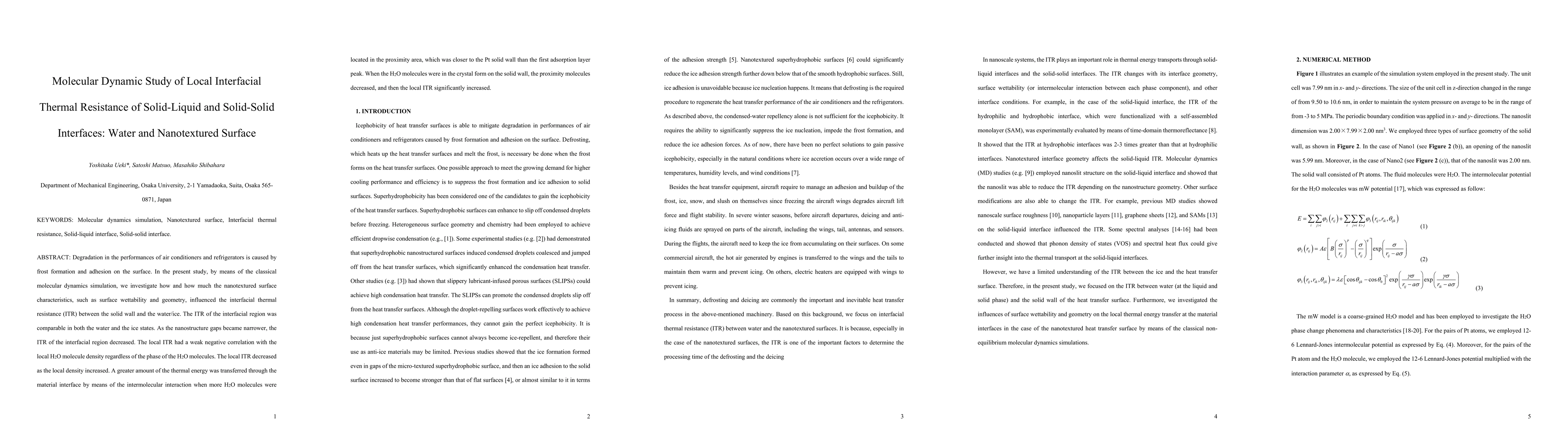 Degradation in performances of air conditioners and refrigerators is caused by a frost formation and adhesion on the surface. In the present study, by means of the classical molecular dynamics simulation, we investigate how and how much the nanotextured surface characteristics, such as surface wettability and geometry, influenced the interfacial thermal resistance (ITR) between the solid wall and the water/ice. The ITR of the interfacial region was comparable in both the water and the ice states. As the nanostructure gaps became narrower, the ITR of the interfacial region decreased. The local ITR had a weak negative correlation with the local H2O molecule density regardless of the phase of the H2O molecules. The local ITR decreased as the local density increased. The greater amount of the thermal energy was transferred through the material interface by means of the intermolecular interaction when more the H2O molecules were located in the proximity area, which was closer to the Pt solid wall than the first adsorption layer peak. When the H2O molecules were in the crystal form on the solid wall, the proximity molecules decreased, and then the local ITR significantly increased.