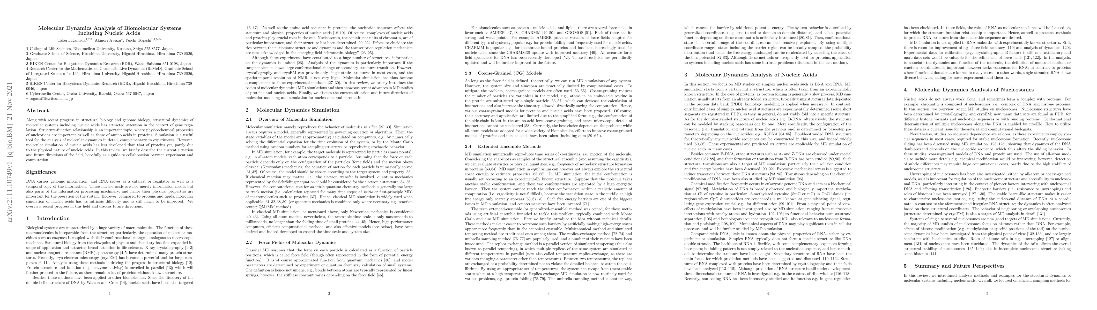 The paper reviews the current state and future directions of molecular dynamics analysis of biomolecular systems, focusing on nucleic acids, and highlights the complementary role of simulation to experimental studies.