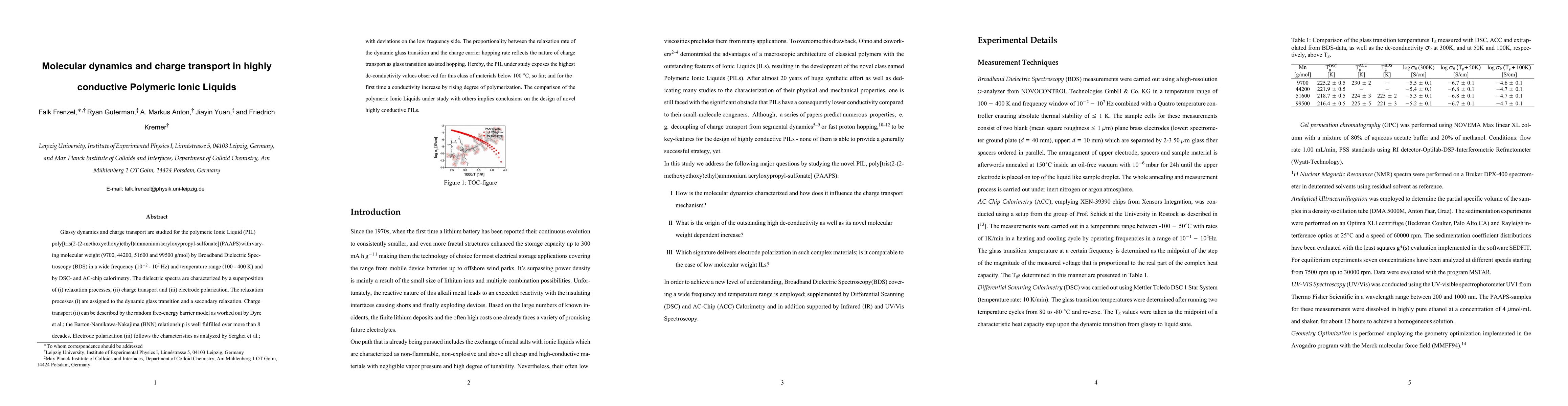 This study investigates the glassy dynamics and charge transport in polymeric ionic liquid PAAPS using broadband dielectric spectroscopy and calorimetry. The findings reveal a high dc-conductivity, with an increase observed with higher molecular weight, and suggest a glass transition-assisted hopping mechanism for charge transport.