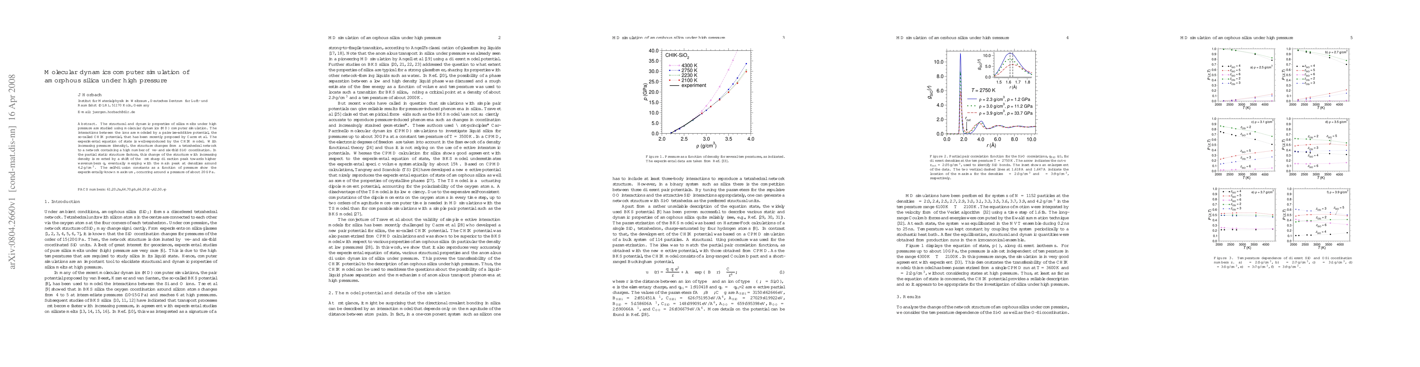 This study uses molecular dynamics simulations to investigate the structural and dynamic properties of amorphous silica under high pressure, employing the CHIK potential. The simulations reveal a structural transition from a tetrahedral network to a higher density of five- and six-fold Si-O coordination, accompanied by a shift in diffraction peaks and a maximum in self-diffusion constants around 20 GPa.
