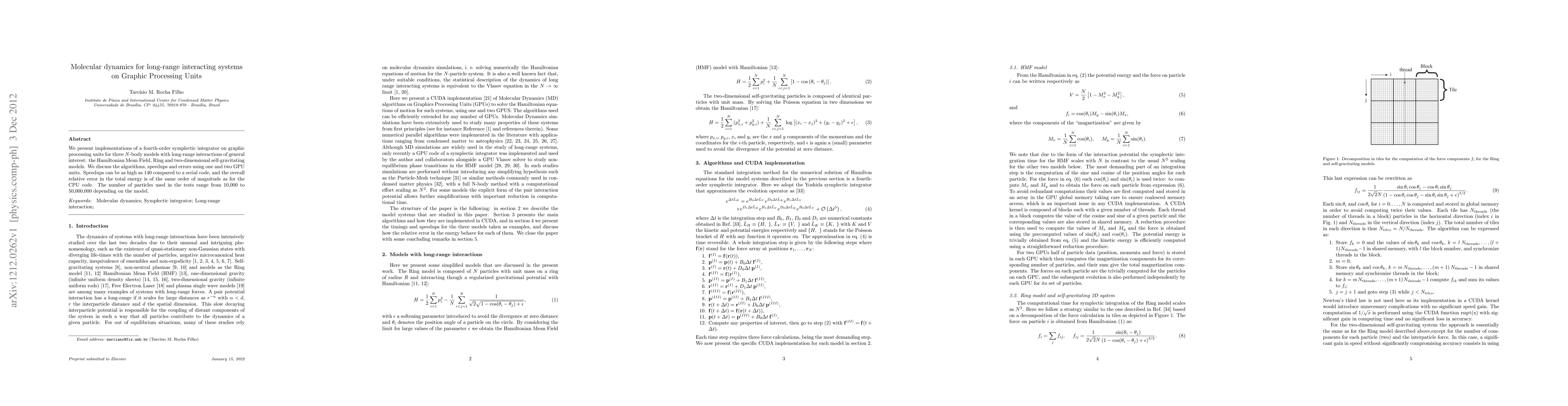 We present implementations of a fourth-order symplectic integrator on graphic processing units for three $N$-body models with long-range interactions of general interest: the Hamiltonian Mean Field, Ring and two-dimensional self-gravitating models. We discuss the algorithms, speedups and errors using one and two GPU units. Speedups can be as high as 140 compared to a serial code, and the overall relative error in the total energy is of the same order of magnitude as for the CPU code. The number of particles used in the tests range from 10,000 to 50,000,000 depending on the model.
