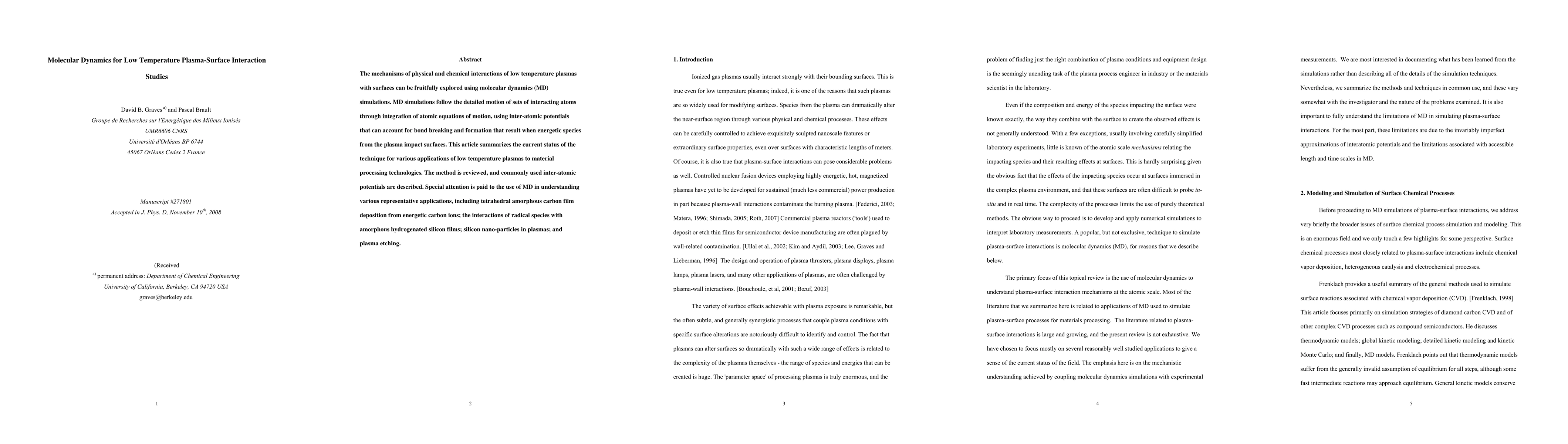 This paper reviews molecular dynamics simulations for studying low temperature plasma-surface interactions, detailing the technique's application to material processing technologies such as carbon film deposition, silicon etching, and interactions with silicon nanoparticles. It highlights commonly used inter-atomic potentials and their role in capturing bond dynamics.