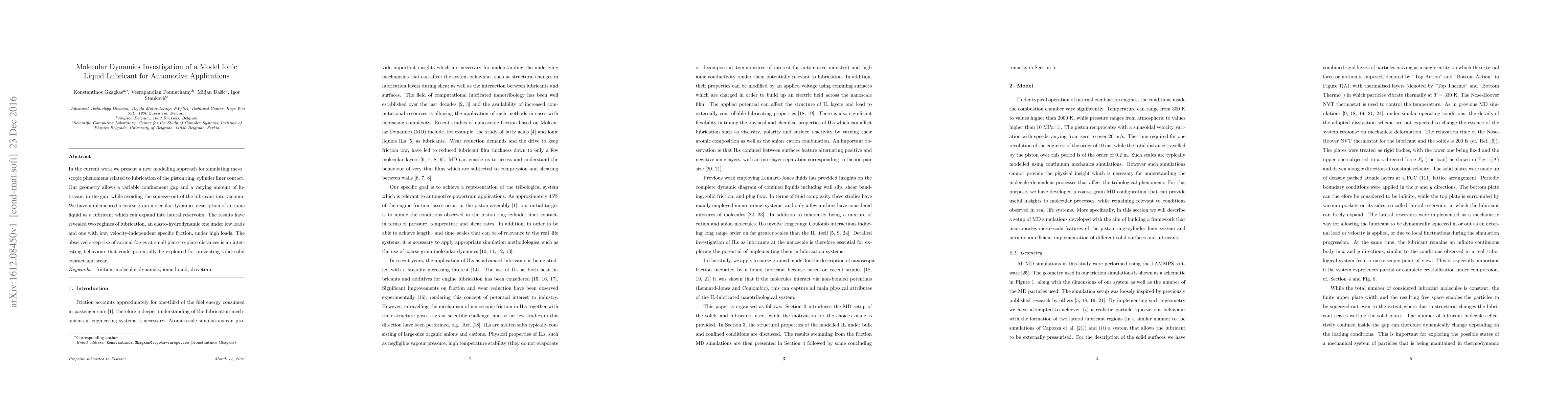 This paper introduces a novel molecular dynamics model for simulating lubrication in automotive piston ring-cylinder liner contacts using a coarse-grained ionic liquid lubricant. The study reveals two distinct lubrication regimes: elasto-hydrodynamic under low loads and low, velocity-independent friction under high loads, with potential for preventing wear through a steep rise in normal forces at small distances.
