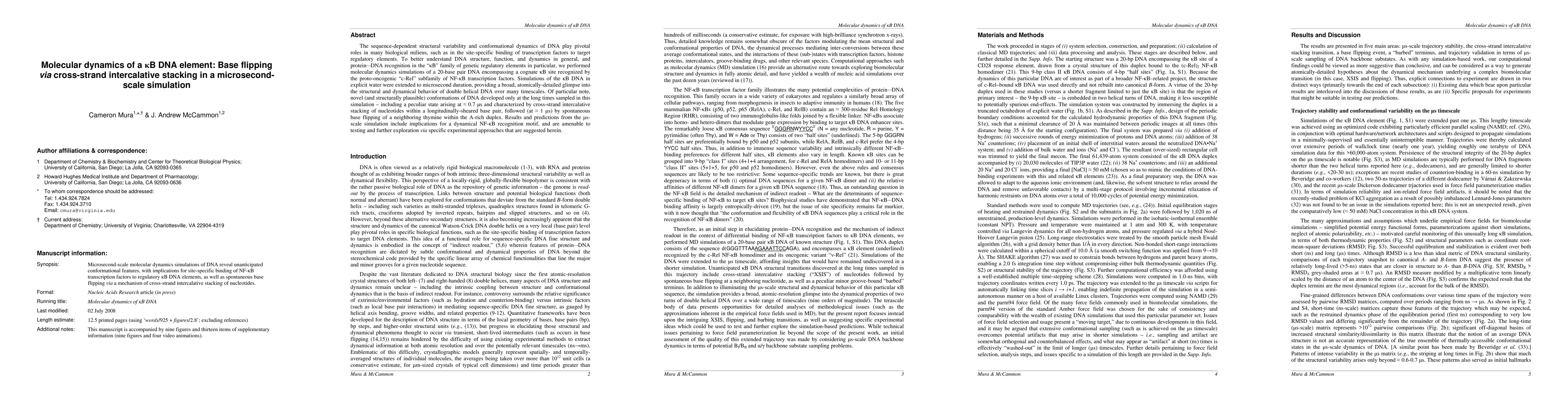 This study uses microsecond-scale molecular dynamics simulations to explore the conformational dynamics of a 20-base pair kB DNA element, revealing novel structural states including cross-strand intercalative stacking and base flipping, which may inform understanding of protein-DNA interactions in the NF-kB family.