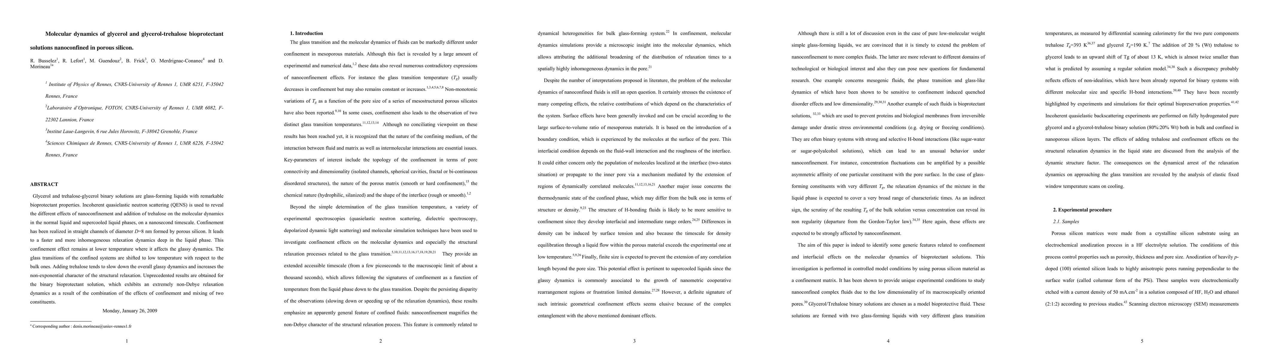 This study uses incoherent quasielastic neutron scattering to investigate how nanoconfinement in porous silicon affects the molecular dynamics of glycerol and glycerol-trehalose solutions, revealing faster and more inhomogeneous relaxation dynamics, especially in the supercooled liquid phase. Adding trehalose slows down glassy dynamics and enhances non-exponential relaxation behavior.